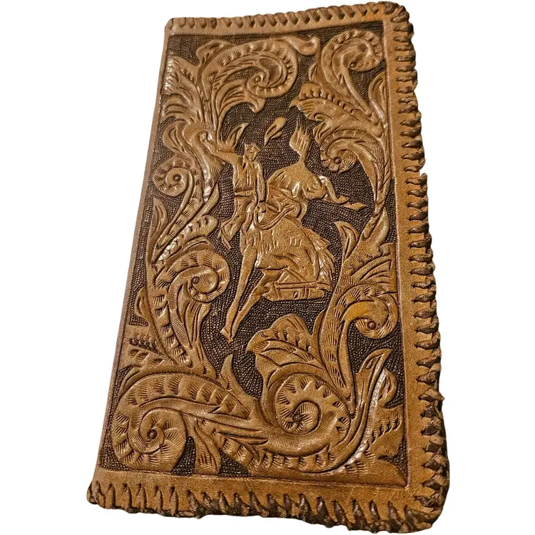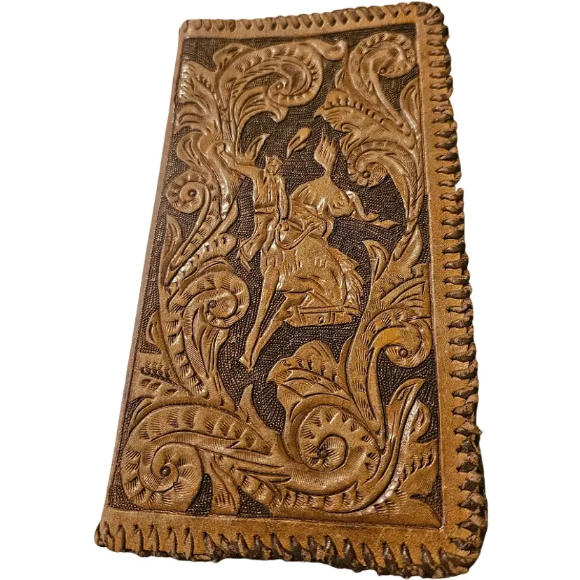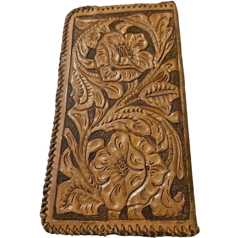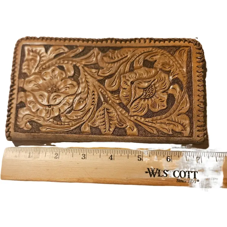 This handcrafted brown leather wallet features intricate floral designs, offering both style and functionality. Perfect for everyday use.