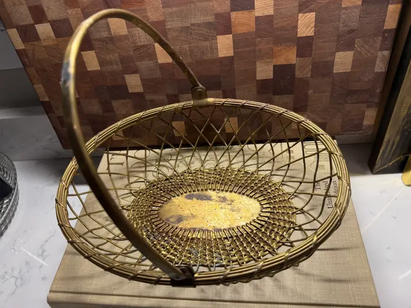 Vintage Hand-Woven Braided Brass Wire Basket with Swivel Handle. This beautiful decorative basket features an intricate hand-woven and braided wire pattern, perfect for a rustic or bohemian home aesthetic.