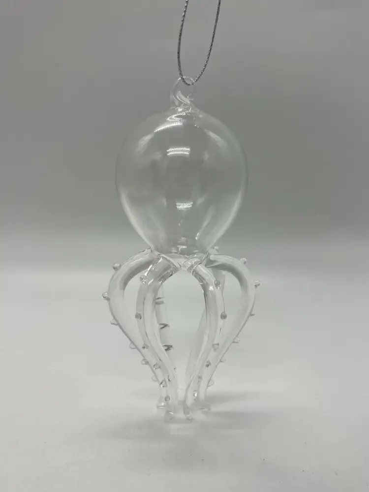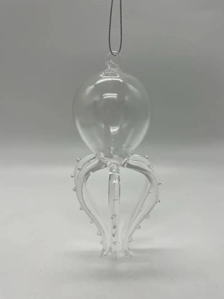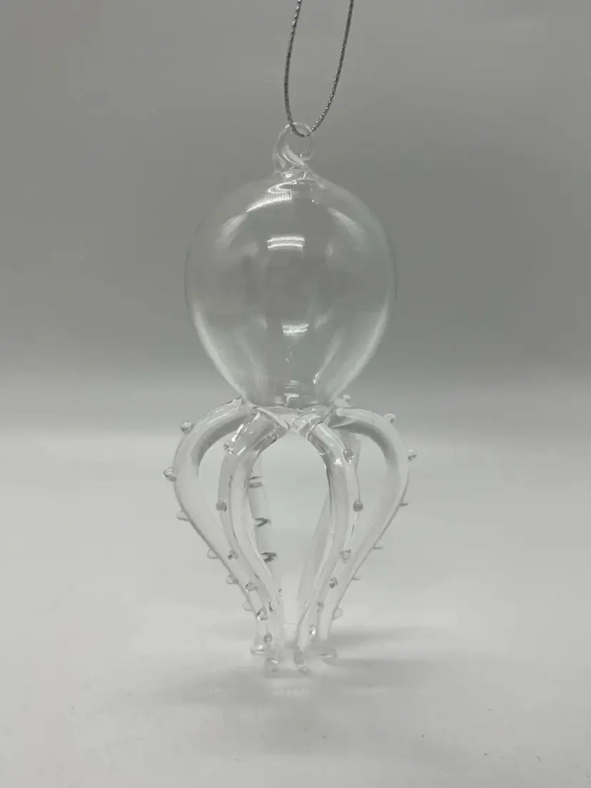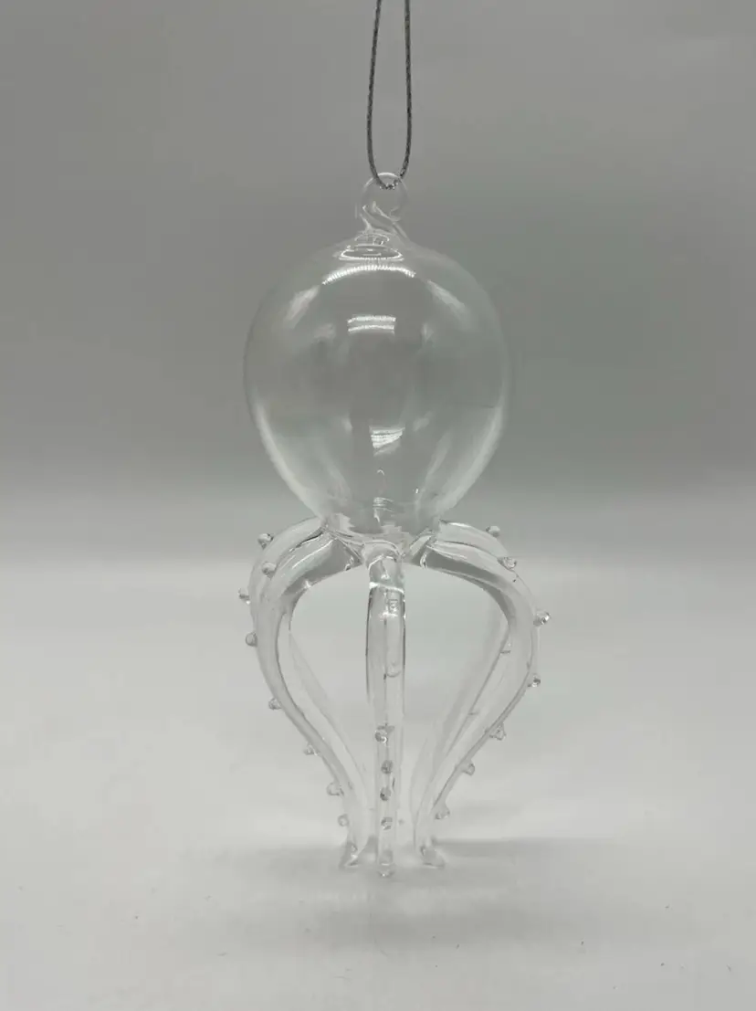 This unmarked handblown art glass ornament features a unique design of a marine life creature with 6 legs/tentacles. The clear glass piece is shaped in a figural form, with intricate tentacles and body on display. Measuring 4 7/8 inches in height and 2 1/2 inches in width, this hanging ornament is a whimsical addition to any art glass collection, showcasing the craftsmanship of hand blown glass production techniques.
