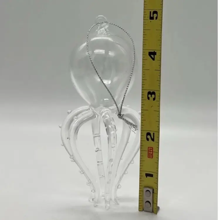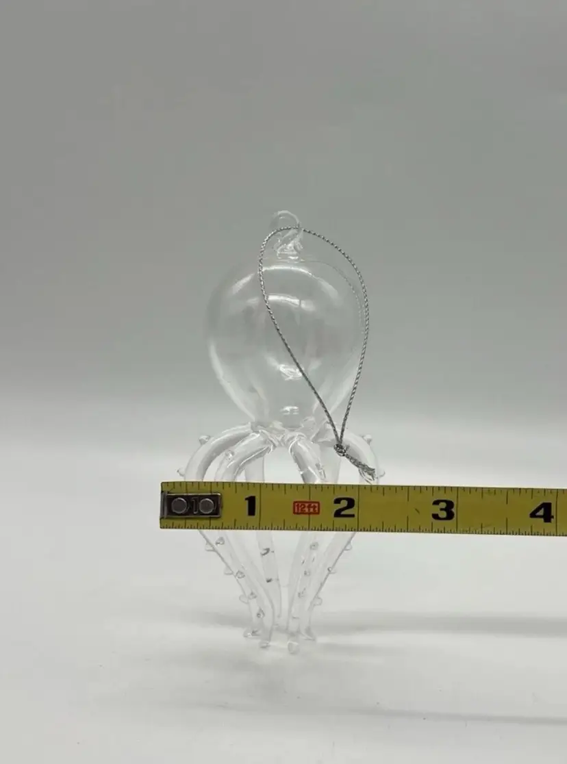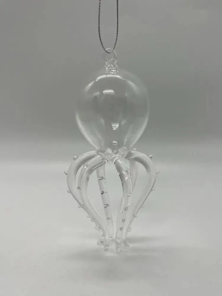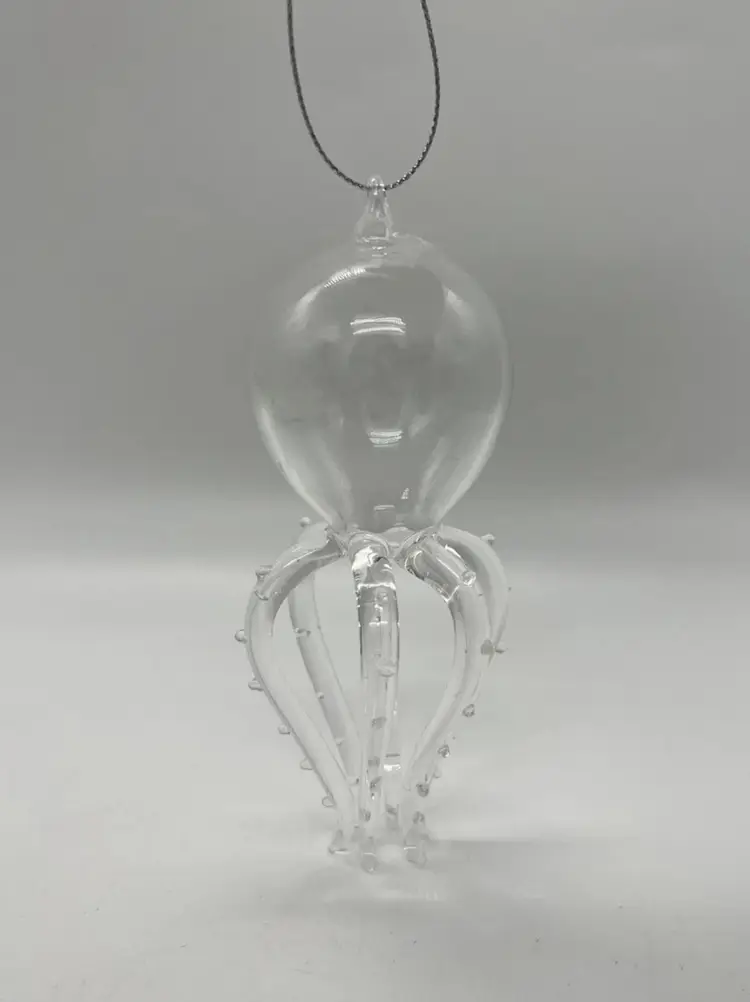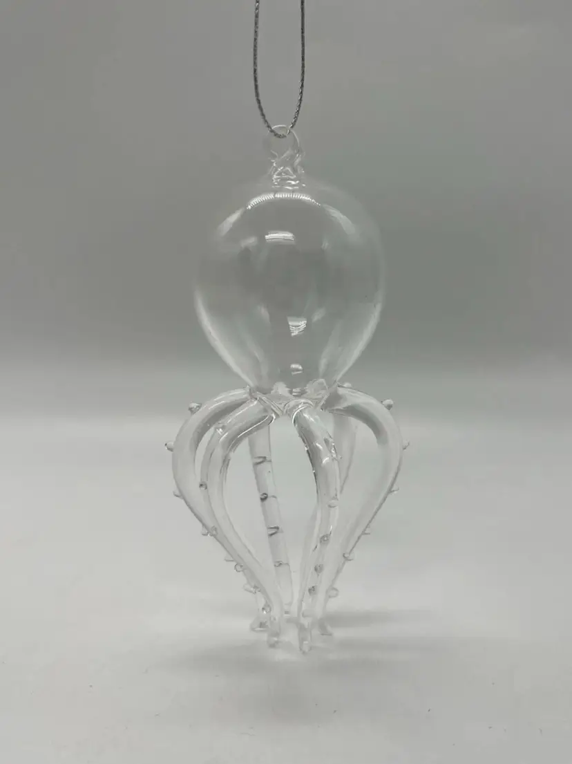 This unmarked handblown art glass ornament features a unique design of a marine life creature with 6 legs/tentacles. The clear glass piece is shaped in a figural form, with intricate tentacles and body on display. Measuring 4 7/8 inches in height and 2 1/2 inches in width, this hanging ornament is a whimsical addition to any art glass collection, showcasing the craftsmanship of hand blown glass production techniques.