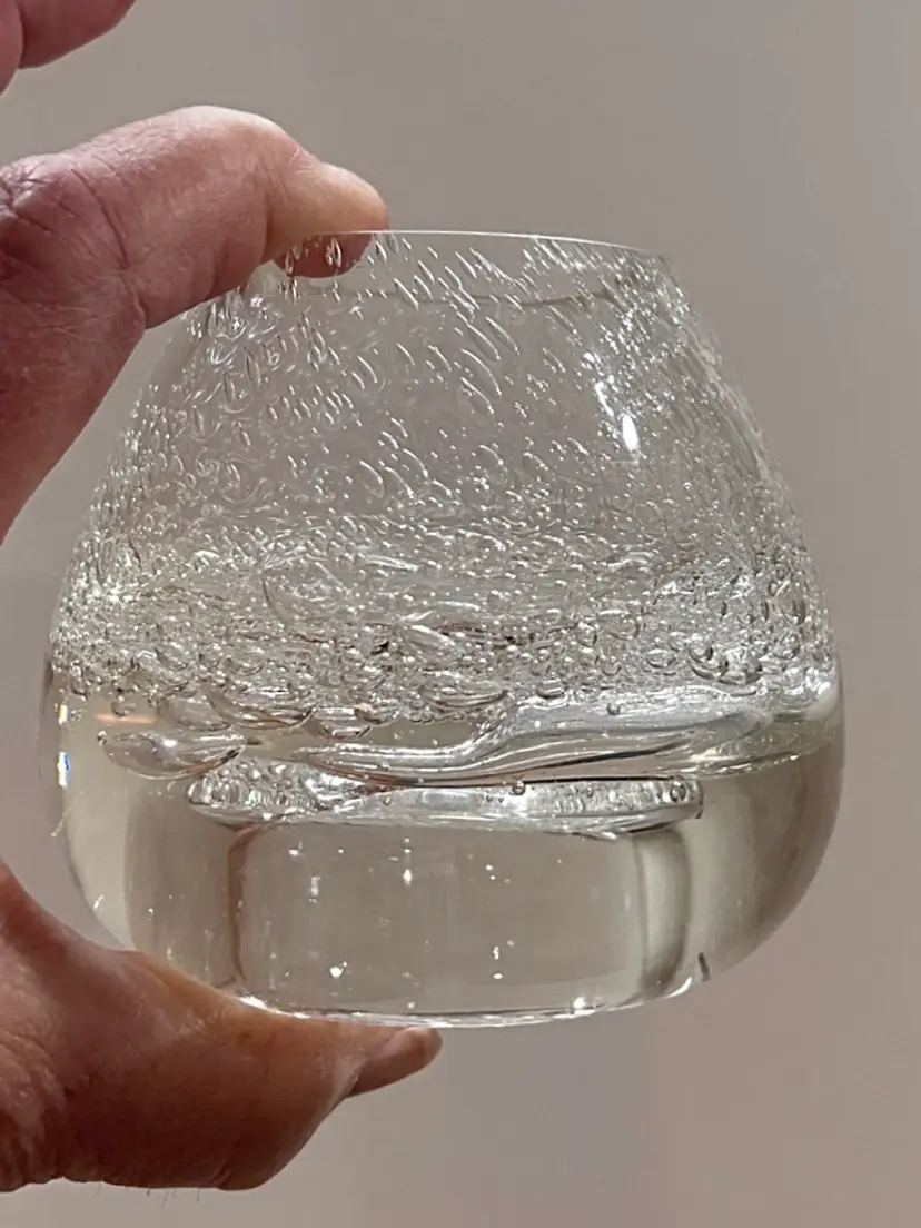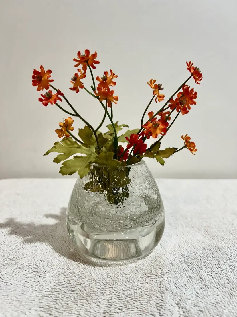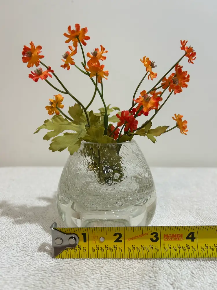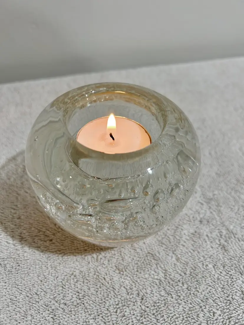 The solid Art Glass and dense bubble pattern give it a distinctive, organic appearance. Very appealing and the clear color will complement a variety of spaces. Excellent condition. No wax buildup, chips, cracks or scratches. Smoked pet free home.
