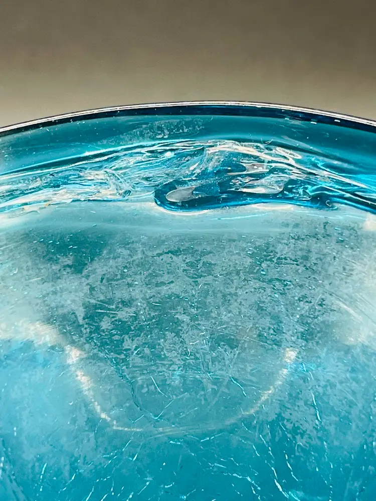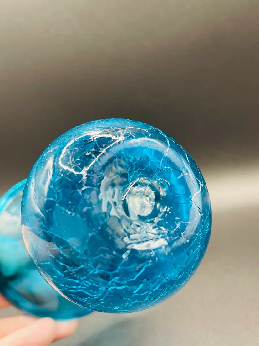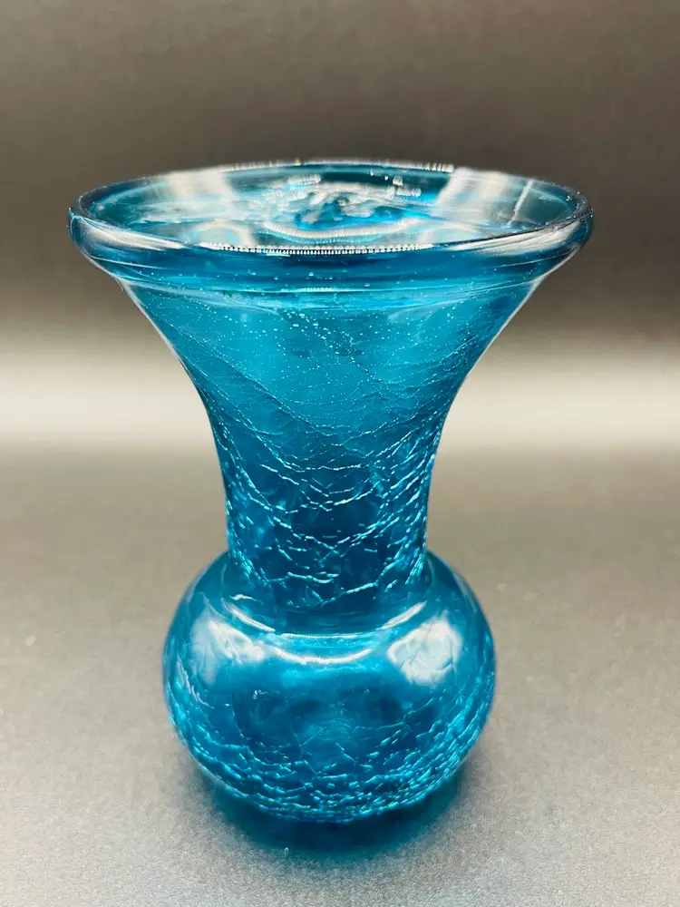 Blue, miniature crackle glass vase. Use it to add a pop of color to a dark shelf, or your go to vase for when your kids pick you dandelions! This stands approximately 4 and a half inches tall, there are no chips or cracks, but there is what I would call a manufacturing defect on one side of the inner rim. It’s not a chip or damage, it just appears that the glass is thicker in that once place. It is shown in the last photo.