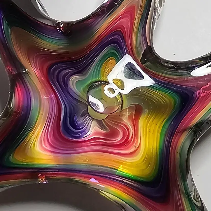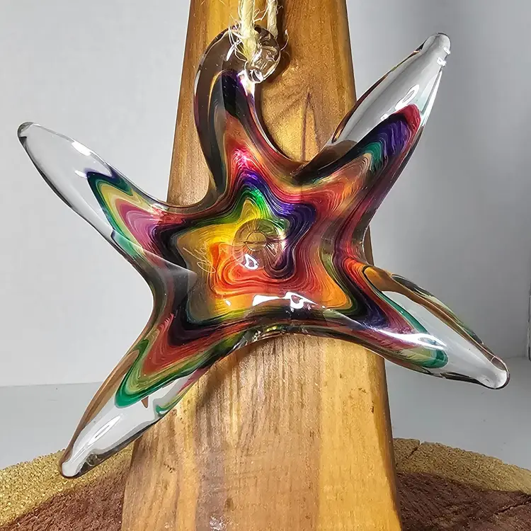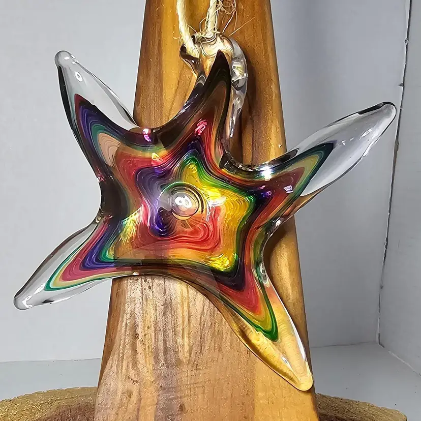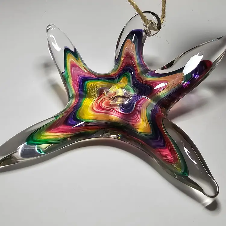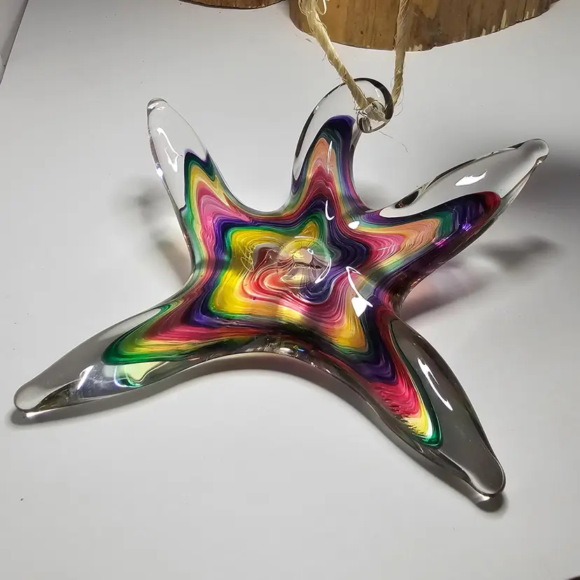 This is a beautiful piece. The white rings you see are from my ring lights. I have included many photos of front and back and some close ups, so you can see the beautiful work in this piece. It is approximately 4 x 4. About 3/4's of an inch thick....a bit higher in some places since it is curved as an actual starfish would be. It has a twisted jute hanger. Thank you for shopping with Beetle's Rucksack.