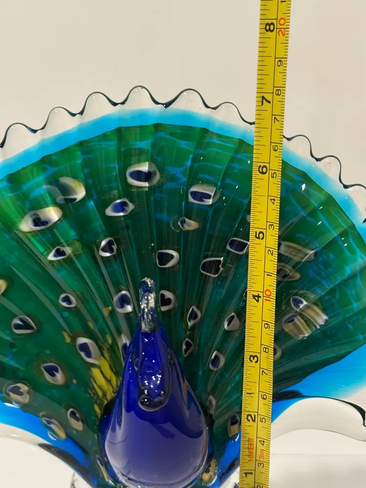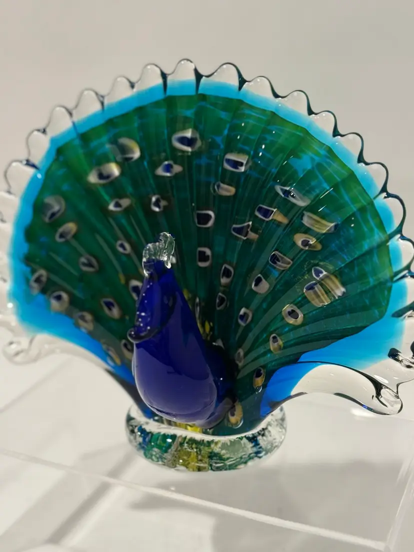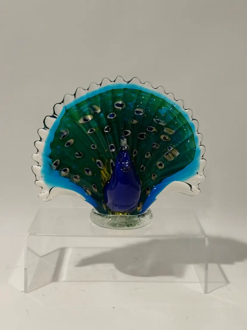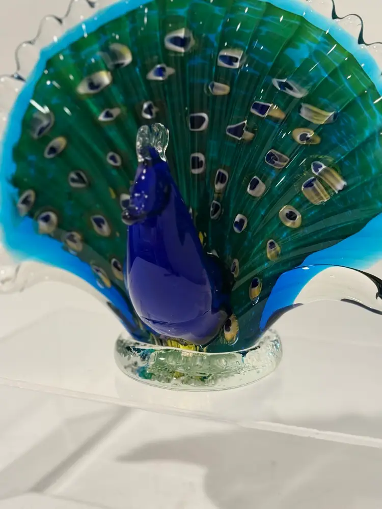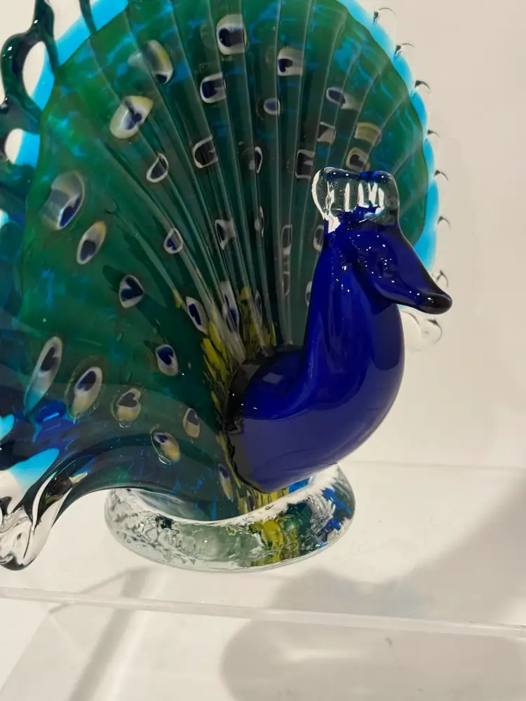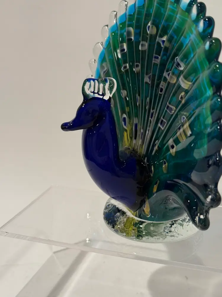 Add a touch of artistry to your collection with this handblown Murano-style glass figurine. The colorful peacock design is intricately crafted with a glossy finish, making it a unique addition to any Mid-Century Modern decor.