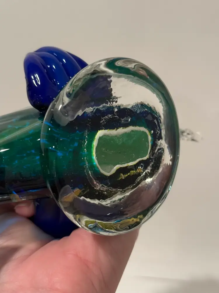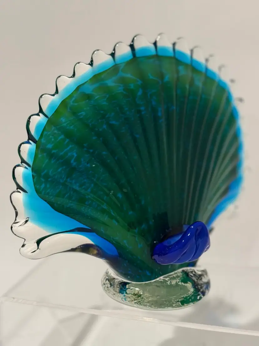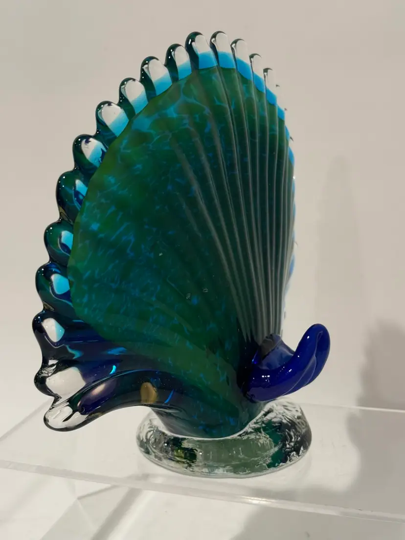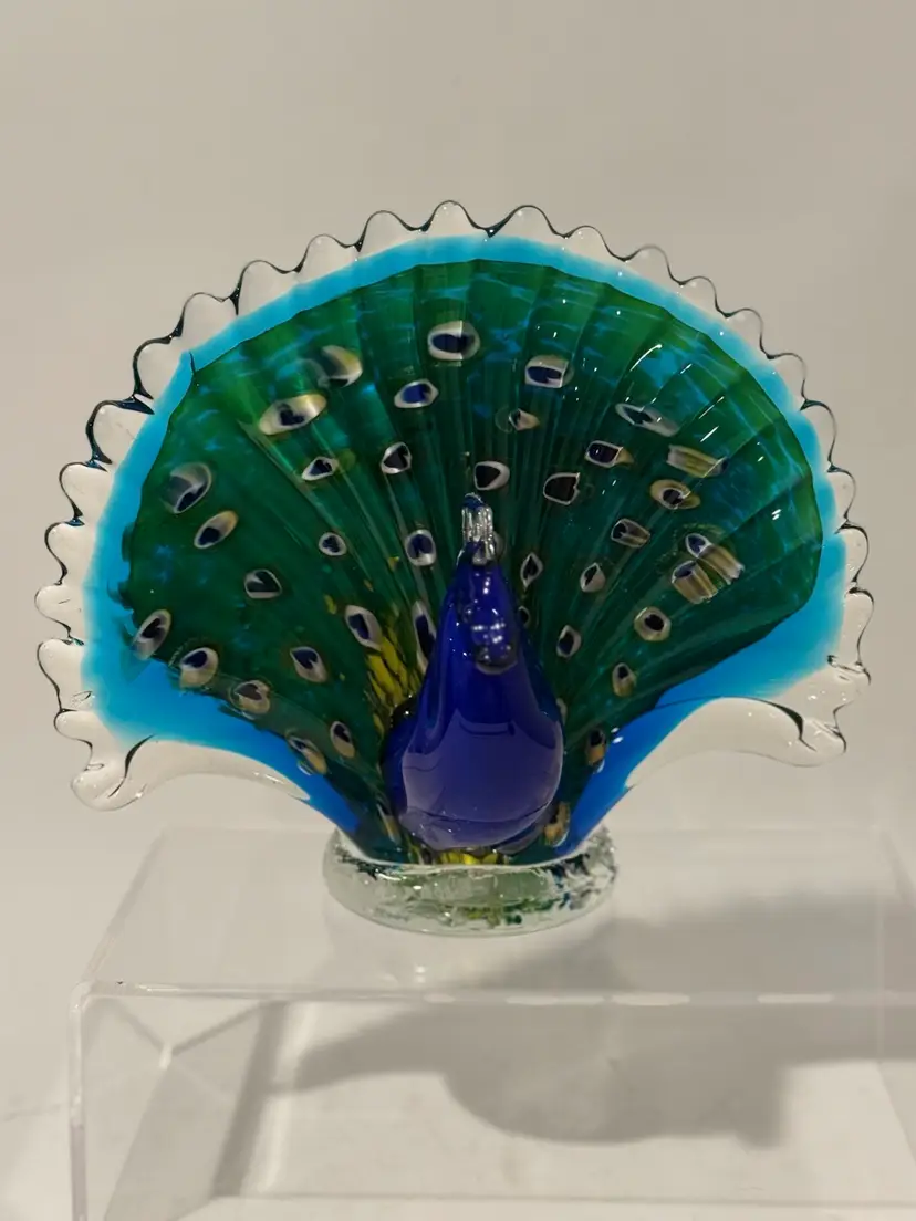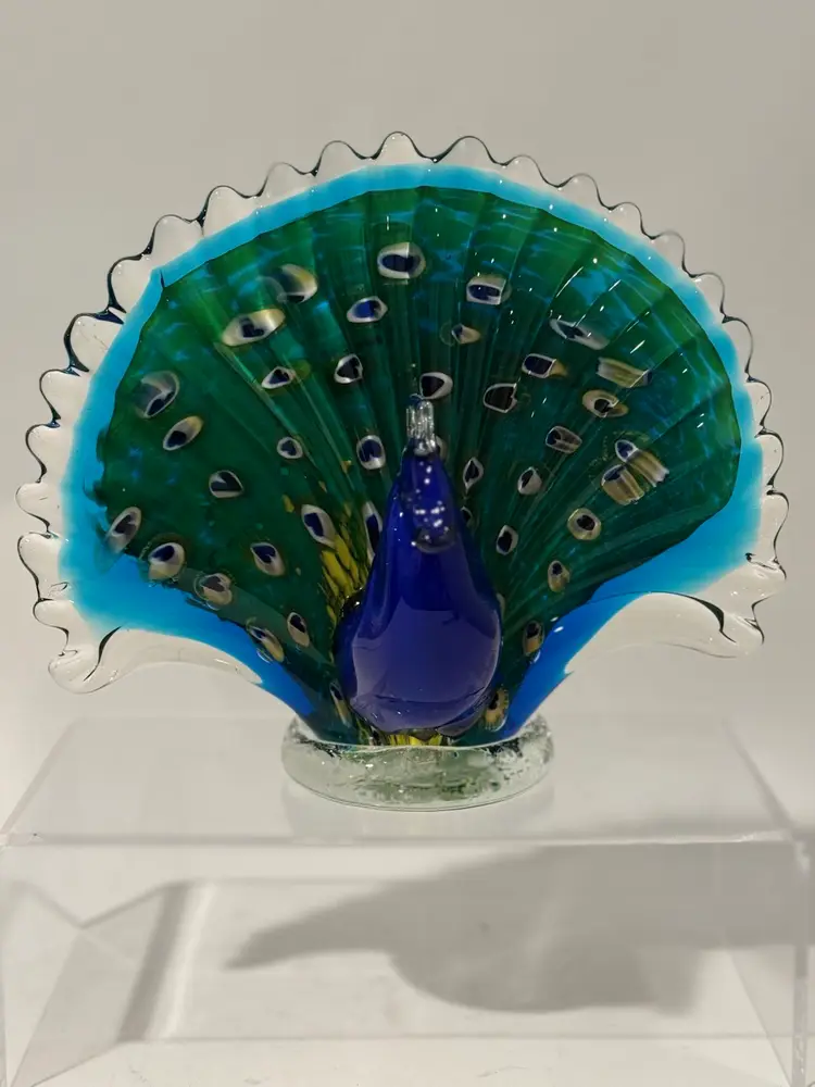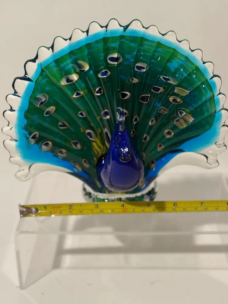 Add a touch of artistry to your collection with this handblown Murano-style glass figurine. The colorful peacock design is intricately crafted with a glossy finish, making it a unique addition to any Mid-Century Modern decor.