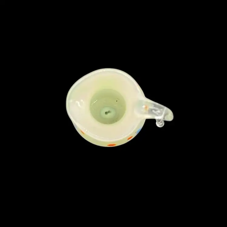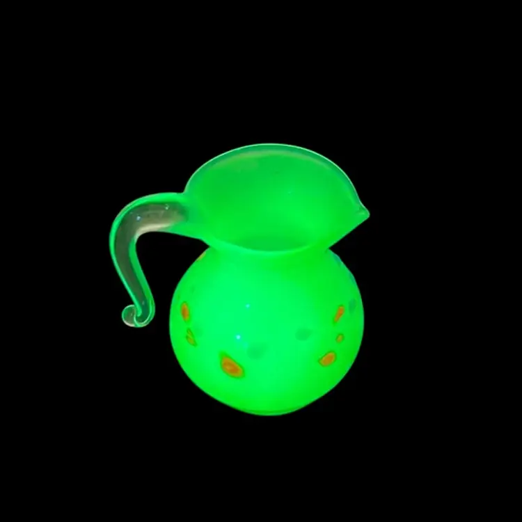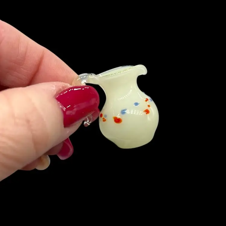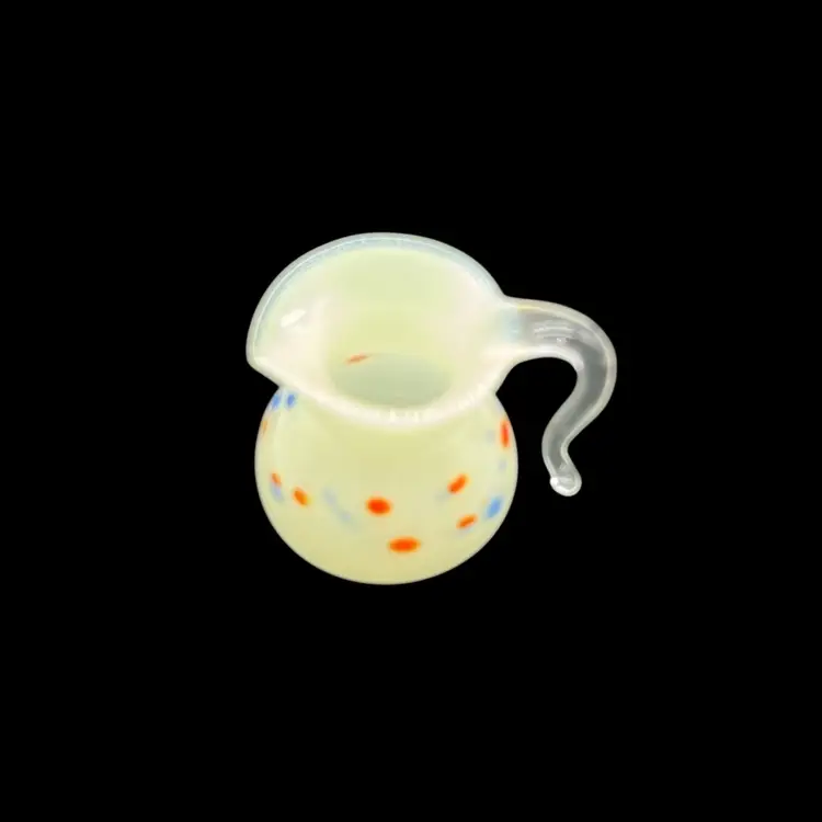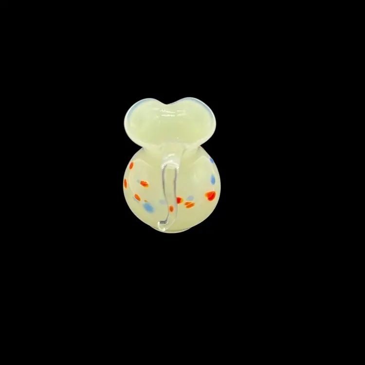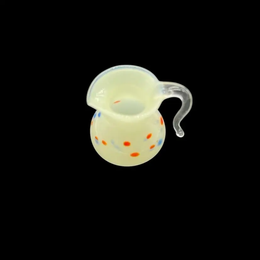 Light cream in color with orange and blue specks. This beauty glows!! The handle is so intricate with a curve! No chips or cracks! Approx: 1”