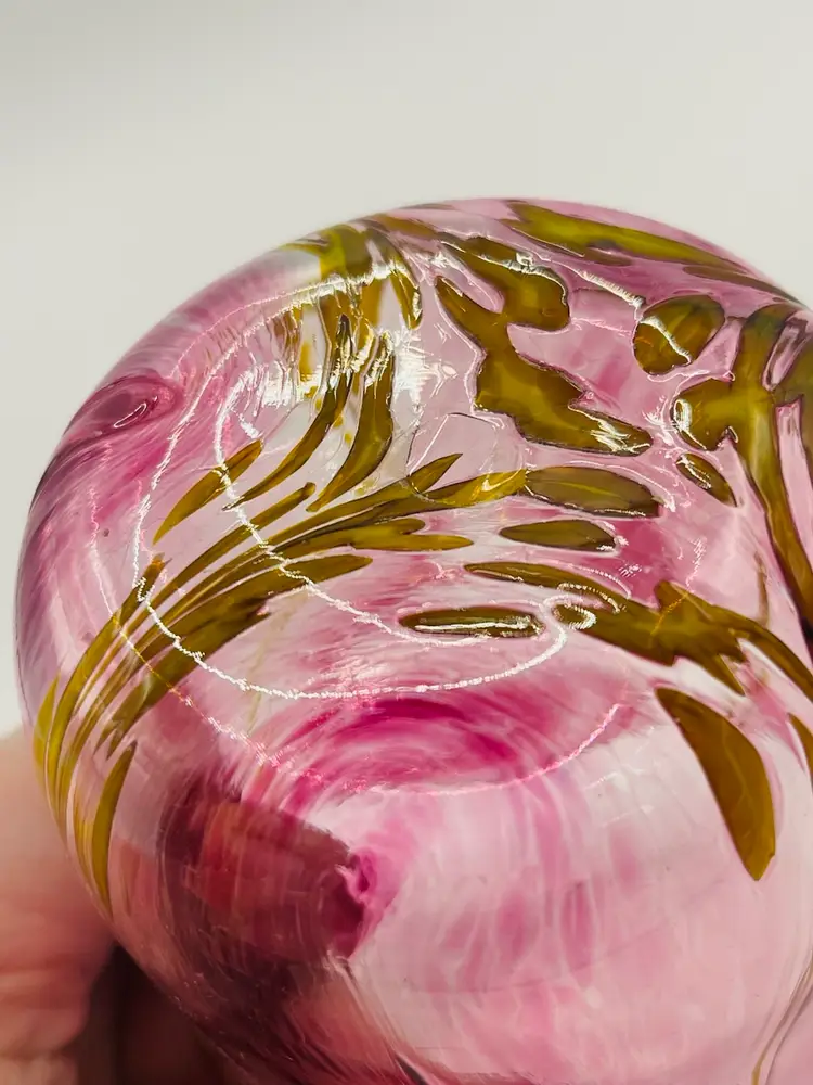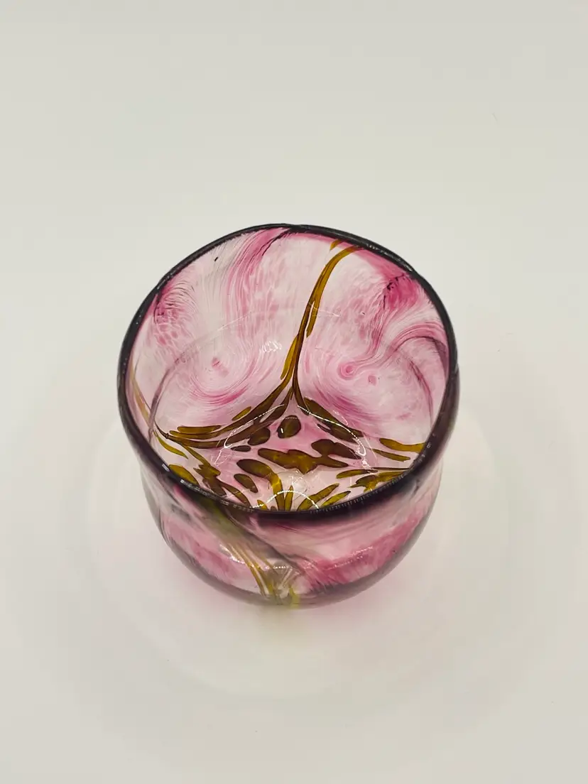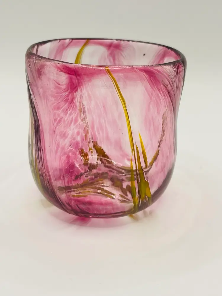 A fun little pop of color! A beautifully swirled, handblown pink and yellow glass votive/small tumbler/vase. Put your favorite little candle in it, use it as a cup for your favorite drink, or use it for a small plant! This stands approximately 3 inches tall, there are no chips or cracks.
