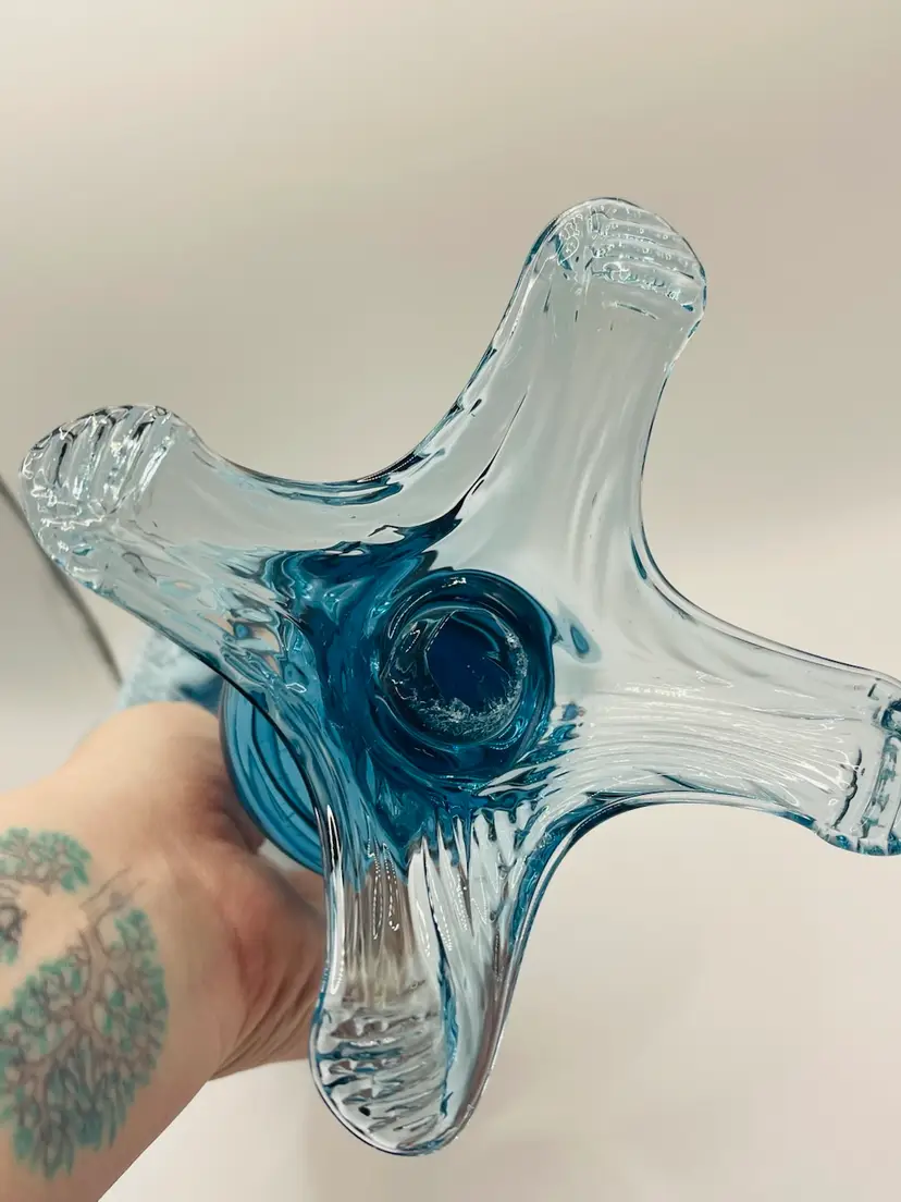 Vintage, handblown, blue glass tulip shaped vase. Stretched by hand to make this beautiful shape! This stands approximately 9 and a quarter inches tall. There are no chips or cracks.