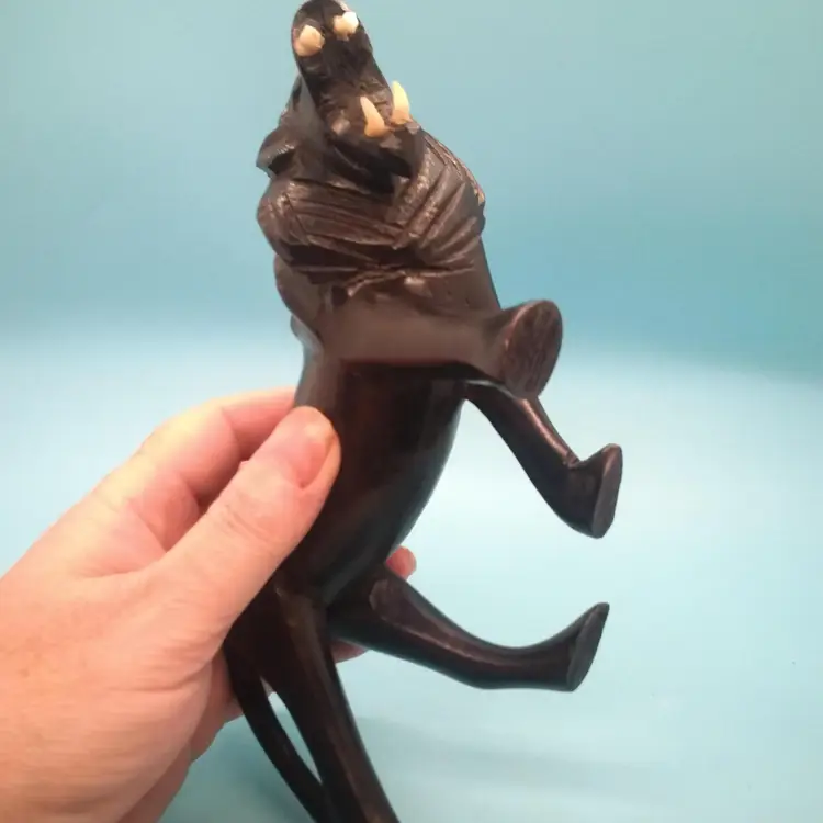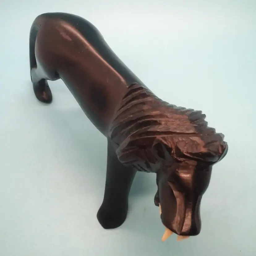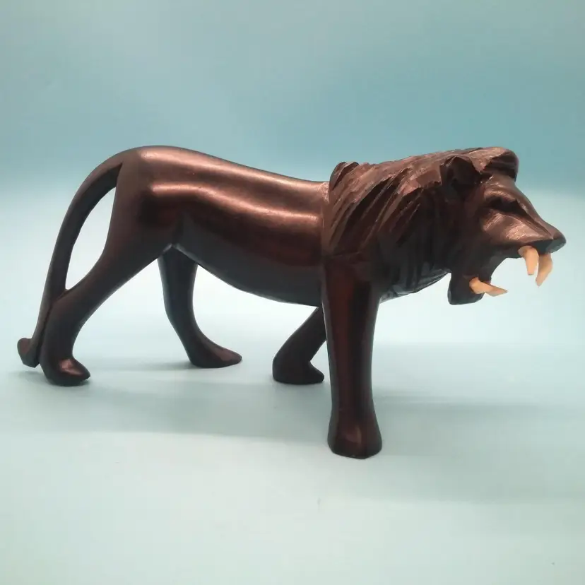 This handcarved iron wood lion figurine showcases intricate details and a fierce expression. Made from a single piece of iron wood, it features a smooth finish and natural wood grain. Perfect for adding a touch of wild elegance to your home decor.