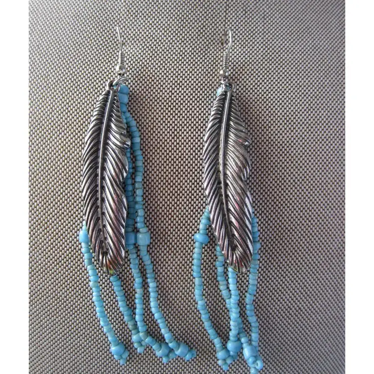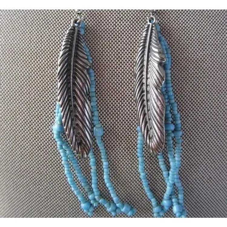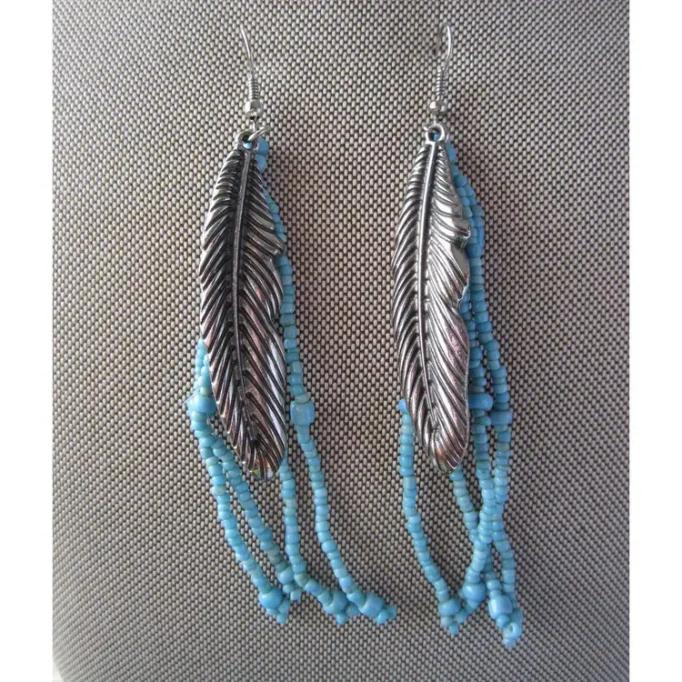 Handcrafted turquoise seed bead dangle earrings with silver feather charms. Earrings dangle 4".