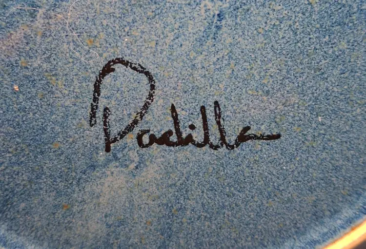 • Unique hand-glazed ceramic plate • Intricate crystalline glaze technique • Celestial-inspired design • Signed by artist Padilla • Decorative wall art or display piece