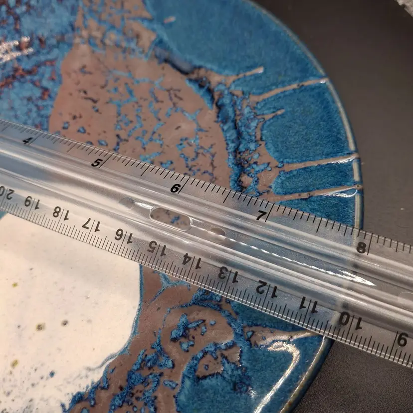 In the quiet corners of a ceramic studio, where clay whispers stories of transformation, this extraordinary plate emerges as a testament to artistic alchemy. The glaze dances across its surface like a lunar landscape, deep azure blues melting into warm terra cotta, creating a mesmerizing topography that suggests distant planetary terrains. Each crystalline formation tells a tale of heat, mineral interaction, and the unpredictable magic of ceramic firing. The white circular element anchors the composition, reminiscent of a moon or distant celestial body suspended in a dreamlike ceramic universe.