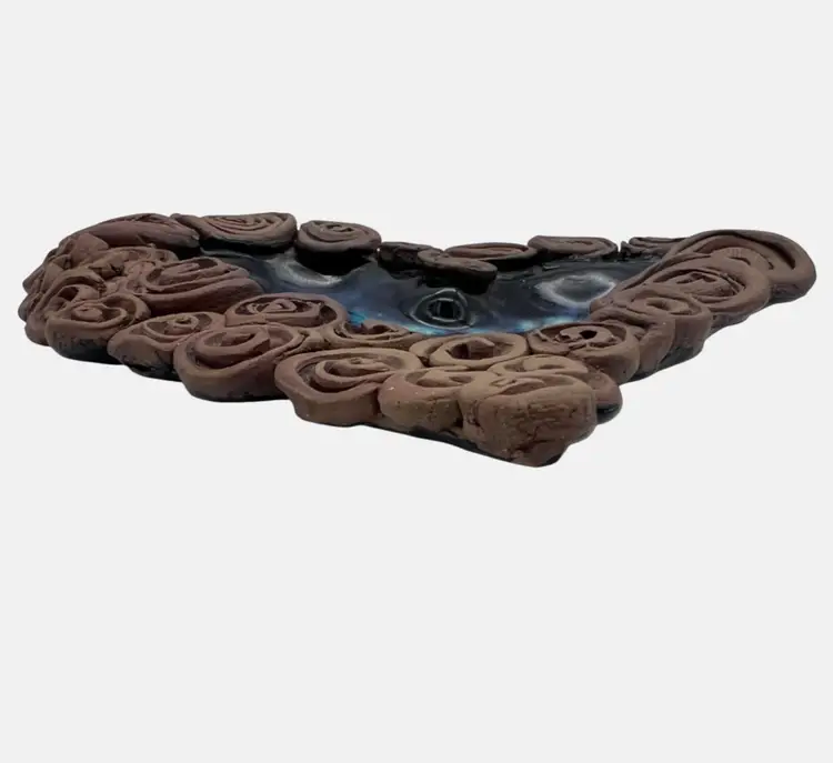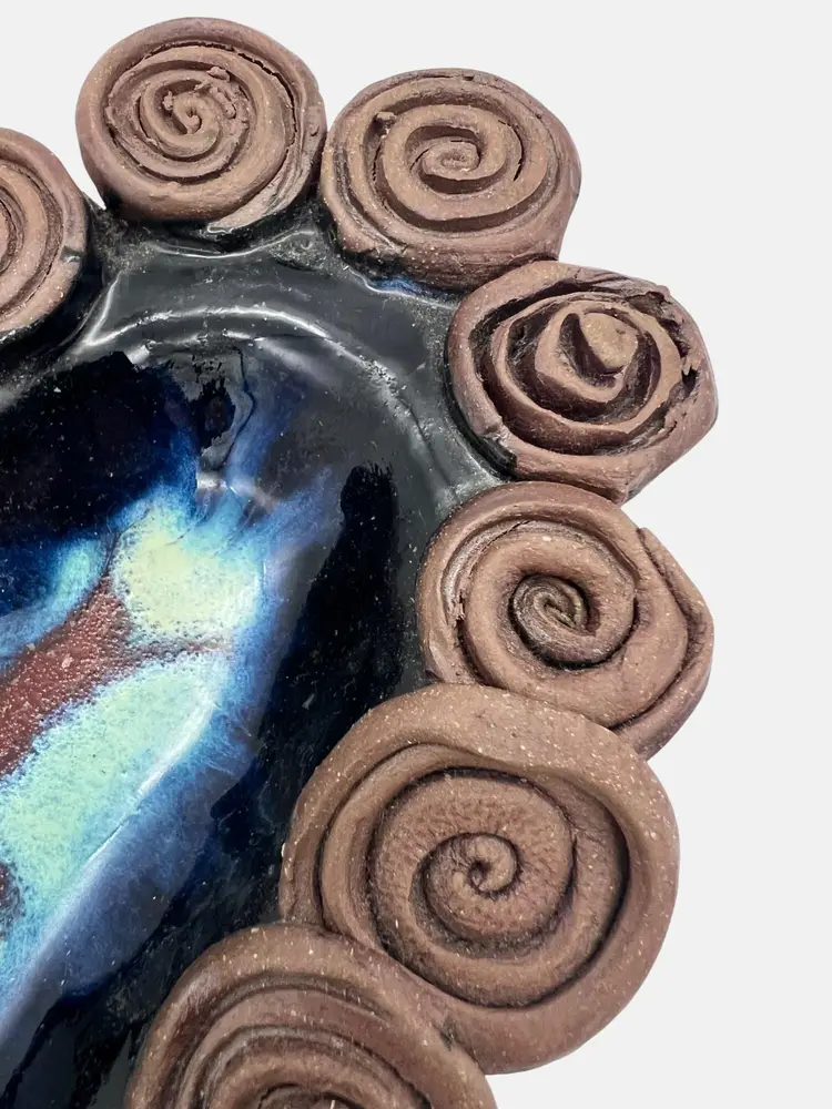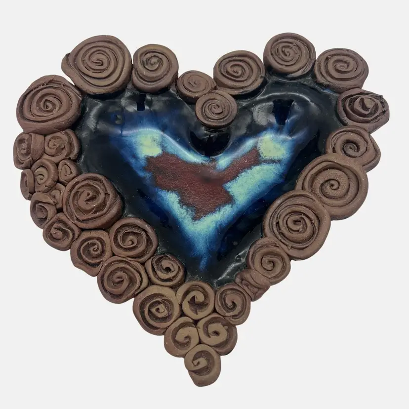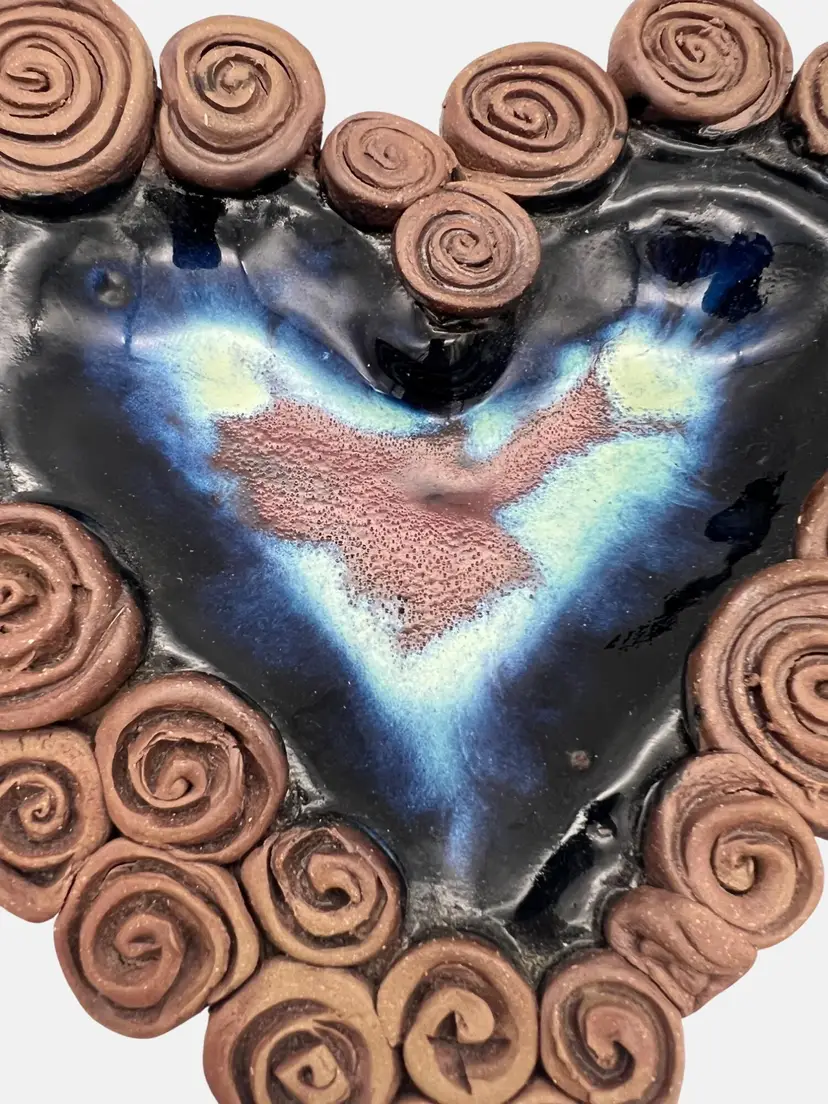 This heart-shaped dish features clay swirls surrounding a glazed center. Ideal for use as an ashtray or a decorative trinket holder. The dish measures approximately 8.5" across at its widest point.