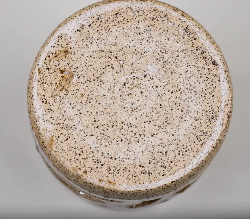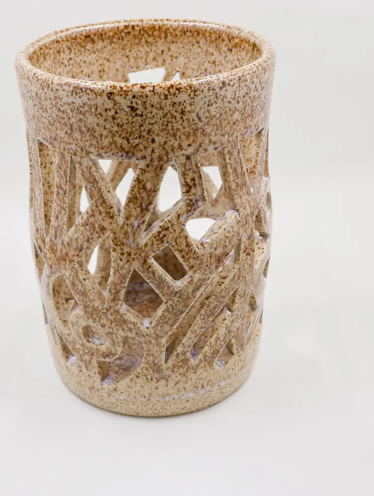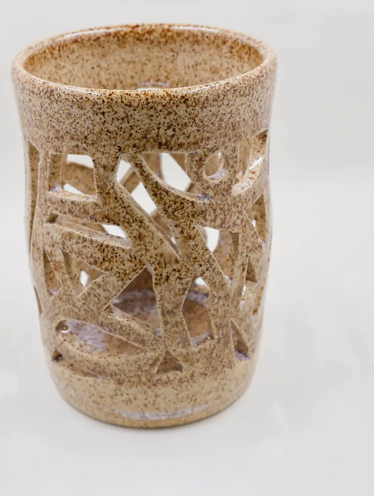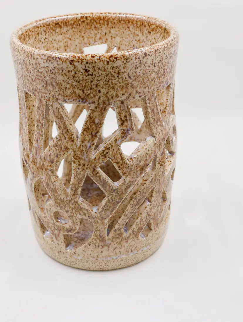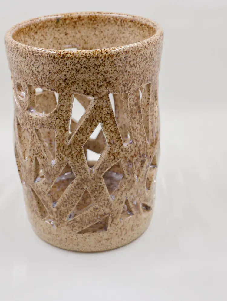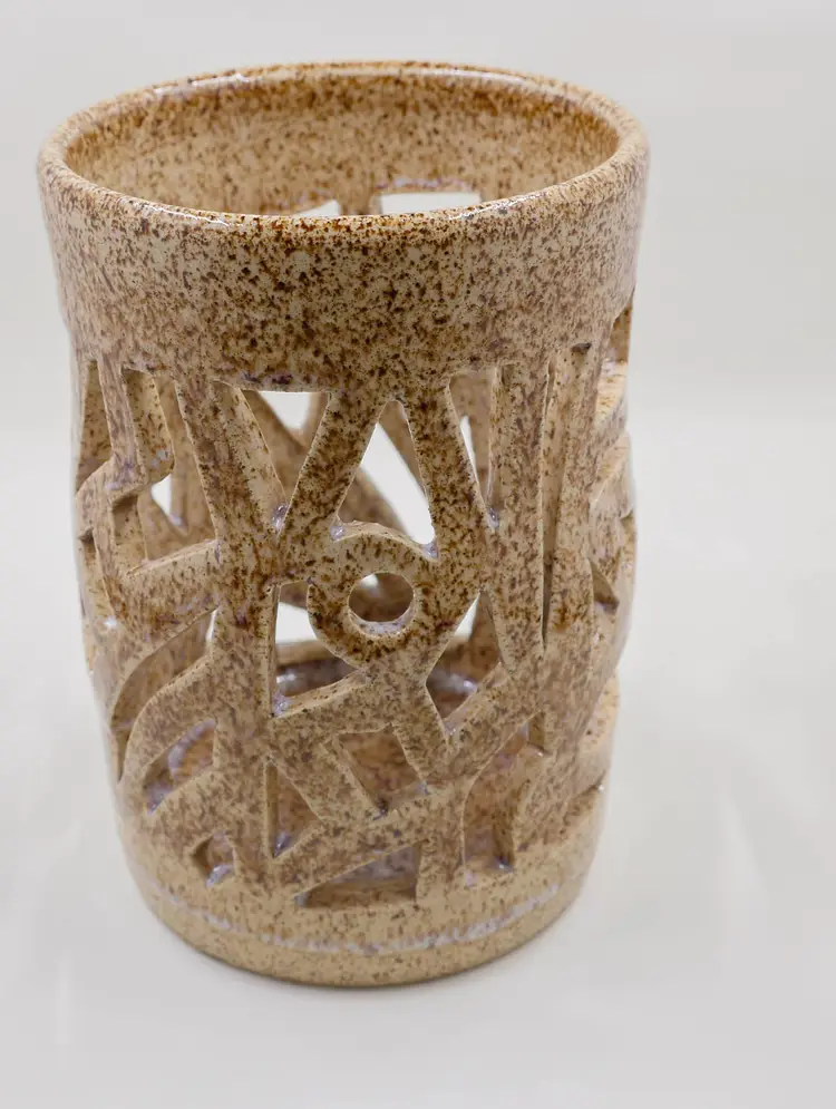 A cylindrical, ceramic luminary with a light brown speckled glaze. The piece has a unique cut-out design around the exterior, with interwoven circular and linear patterns, allowing light to shine through. The bottom is signed "SA" and a small swirl mark which could indicate the artist or studio. Approx. size: 6" tall x 4" wide.