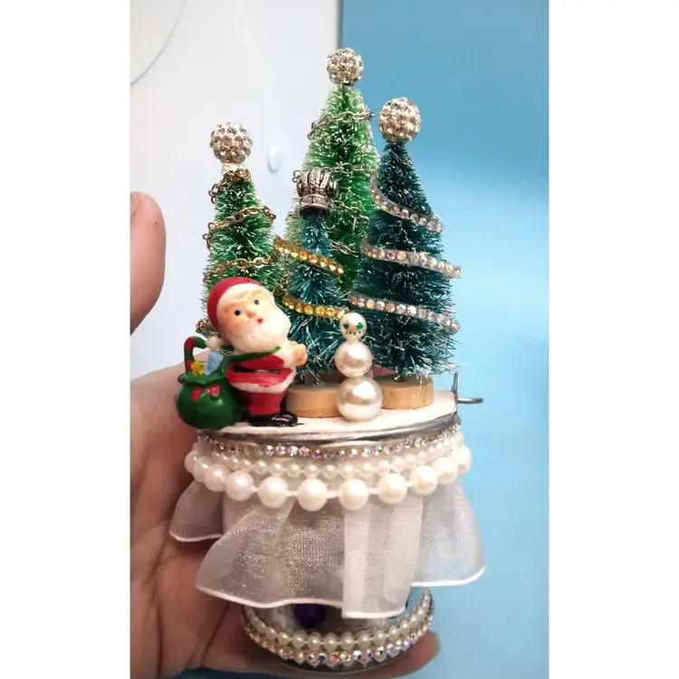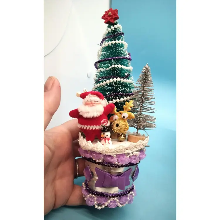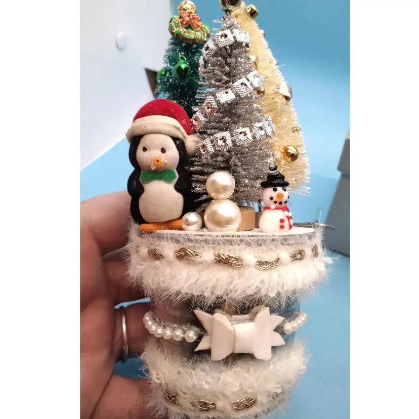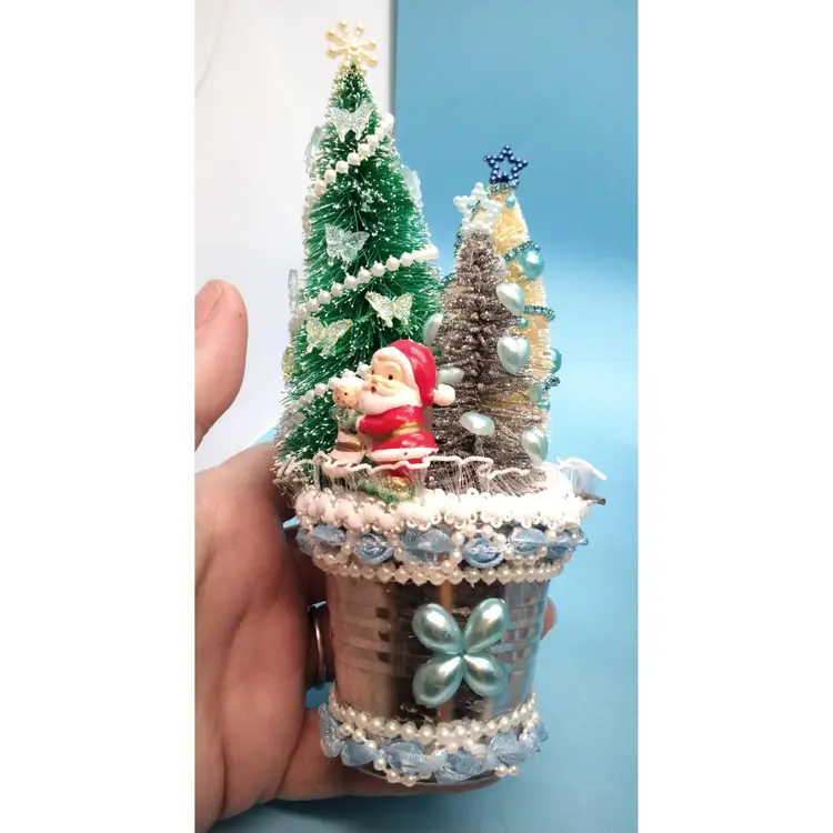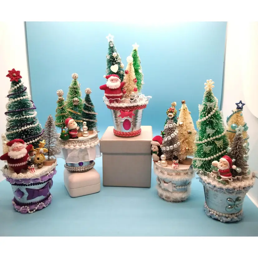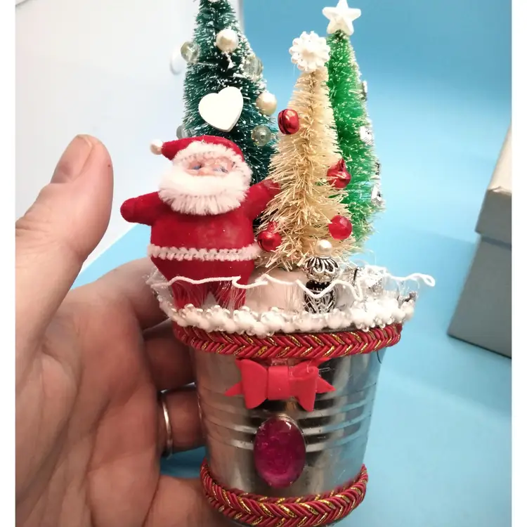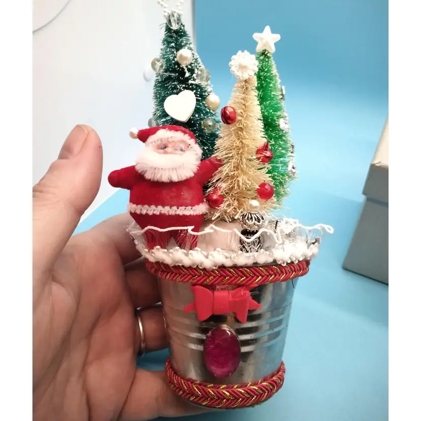 Handcrafted Christmas essemblages, using miniature Galvanized pails as the base. Adding Assorted Sizes and colors of bottlebrush trees. Assorted miniature christmas/winter figurines. Added trims, beads, sequence to decorate. A wonderful gathering of holiday items, creating sweet christmas decoration