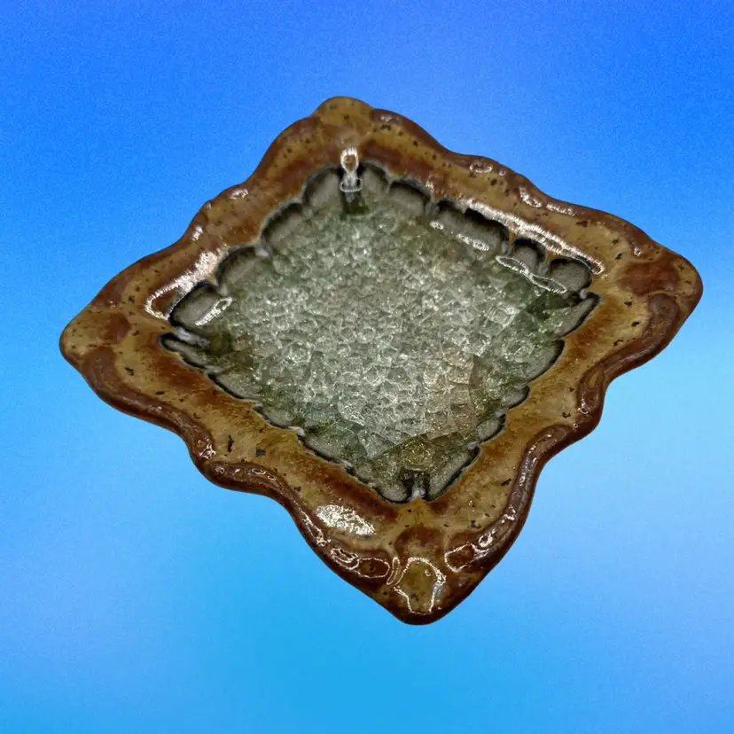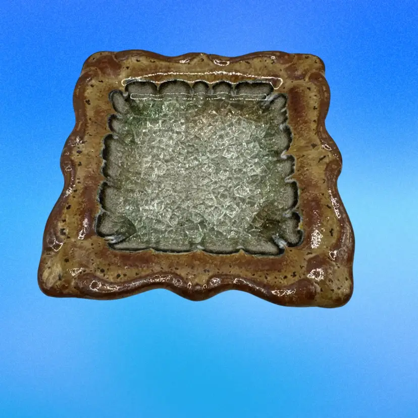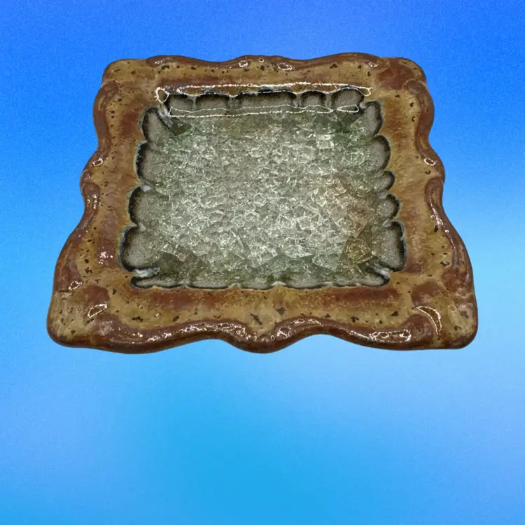 Down To Earth Pottery Artisan Square Plate. Each piece of pottery that Down to Earth creates is hand thrown in Colorado, by a talented team of potters, then expertly glazed by hand and high-fired. Unlike factory-produced pottery, each creation is unique, varying slightly in color, shape, and size making each one a true work of art. Recycled glass is melted down to create layers of iridescent hues within the center of each piece. This eco-friendly feature gives one more reason Down to Earth is so successful. Being 100% handmade in the USA using recycled glass, are also important features of their popularity.