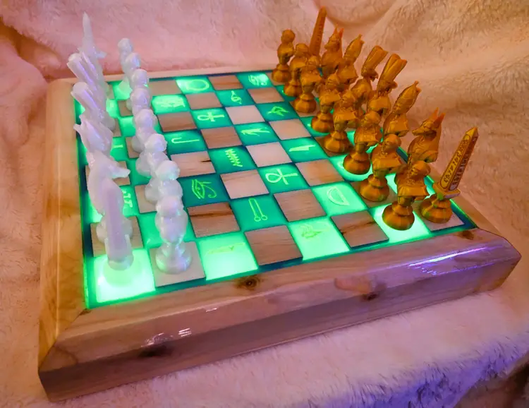 Dive into the kingdom of the Pharaohs with this handcrafted chess set featuring intricately designed Egyptian Pieces. The board combines maple hardwood with a striking epoxy finish, while the pieces are crafted in shimmering gold and silver tones. Perfect for chess enthusiasts and collectors alike.