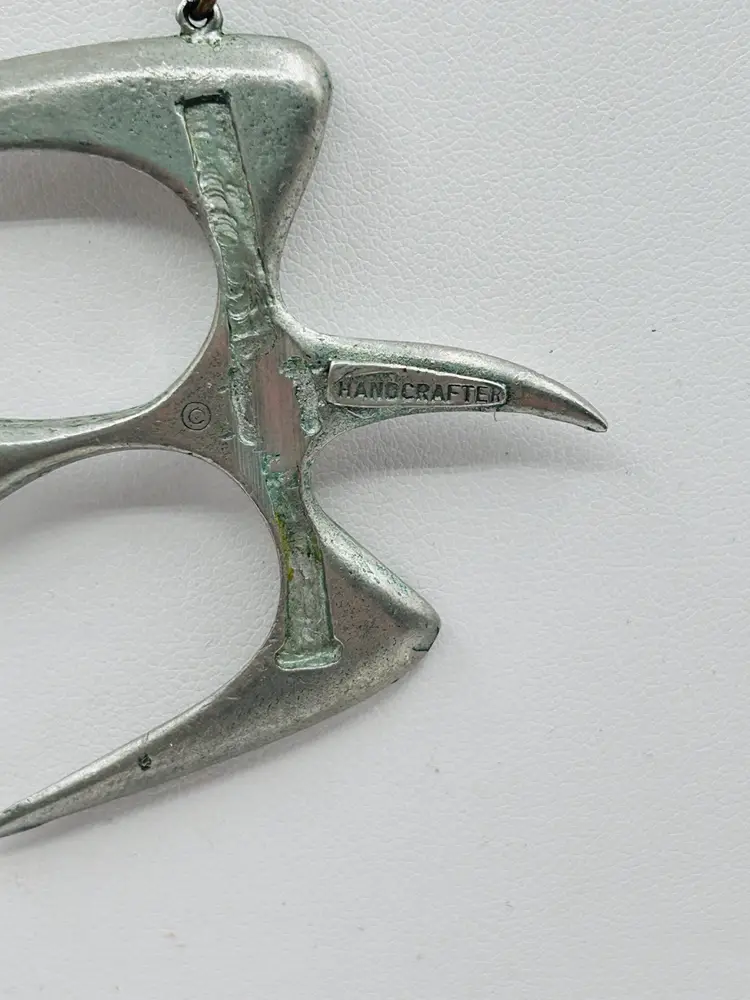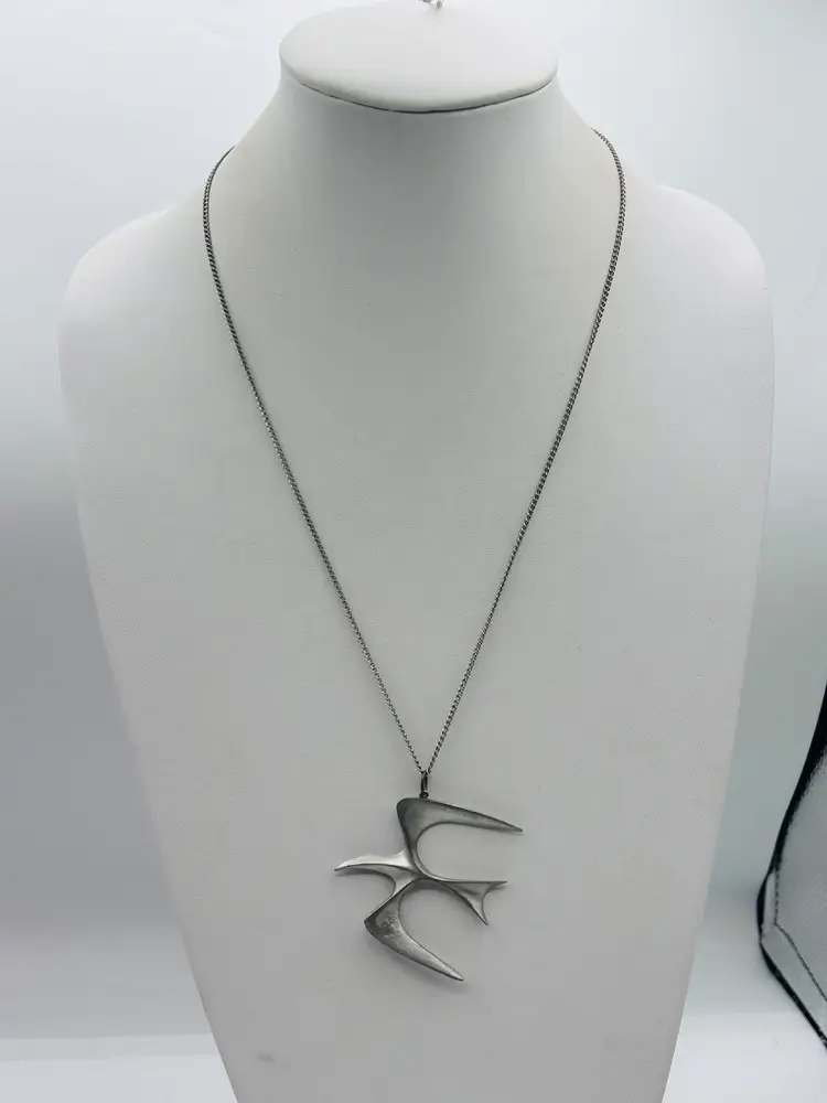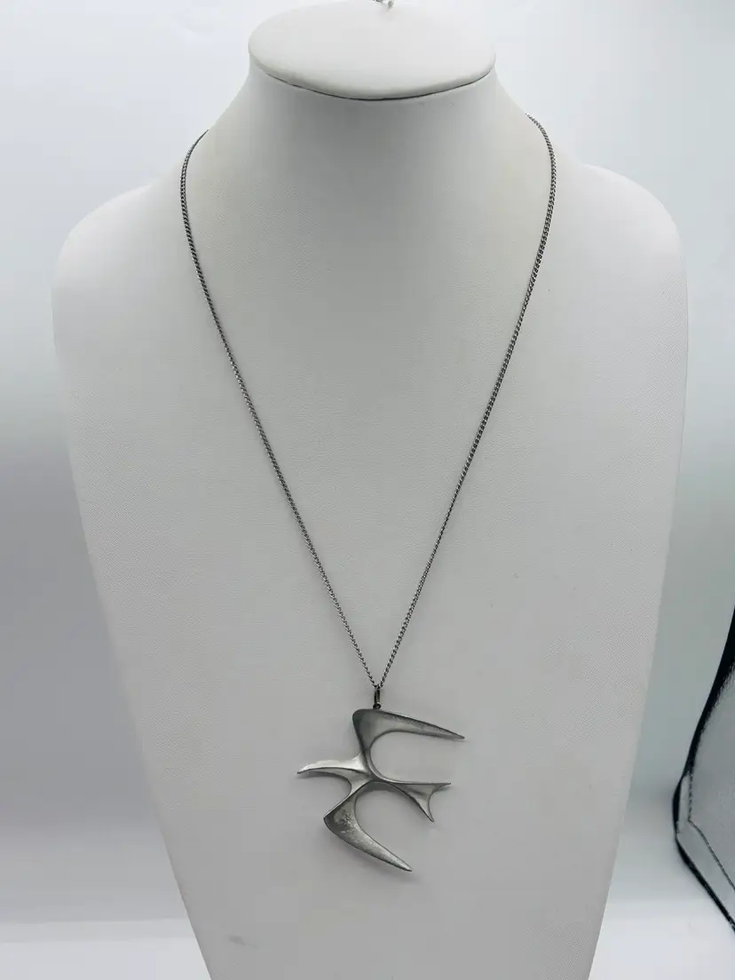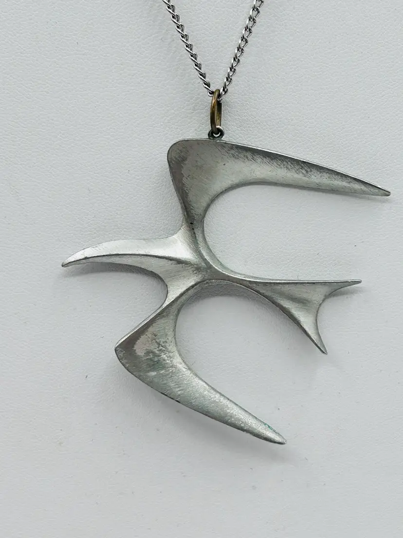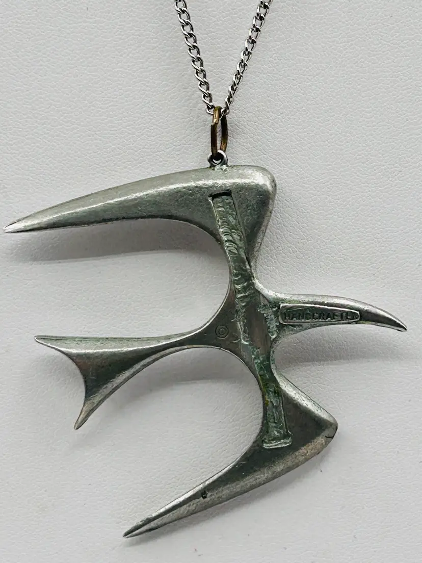 Unknown metal type handcrafted, bird and flight large pendant 2 1/2 inches wide chain is approximately an 18 inch drop.