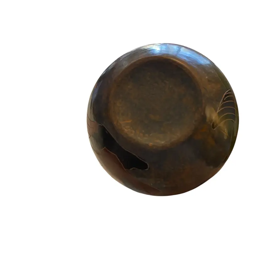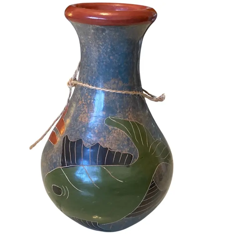 handcrafted folk art pottery, likely from Mexico or Nicaragua, featuring painted fish or aquatic designs. Vase jug 6in tall