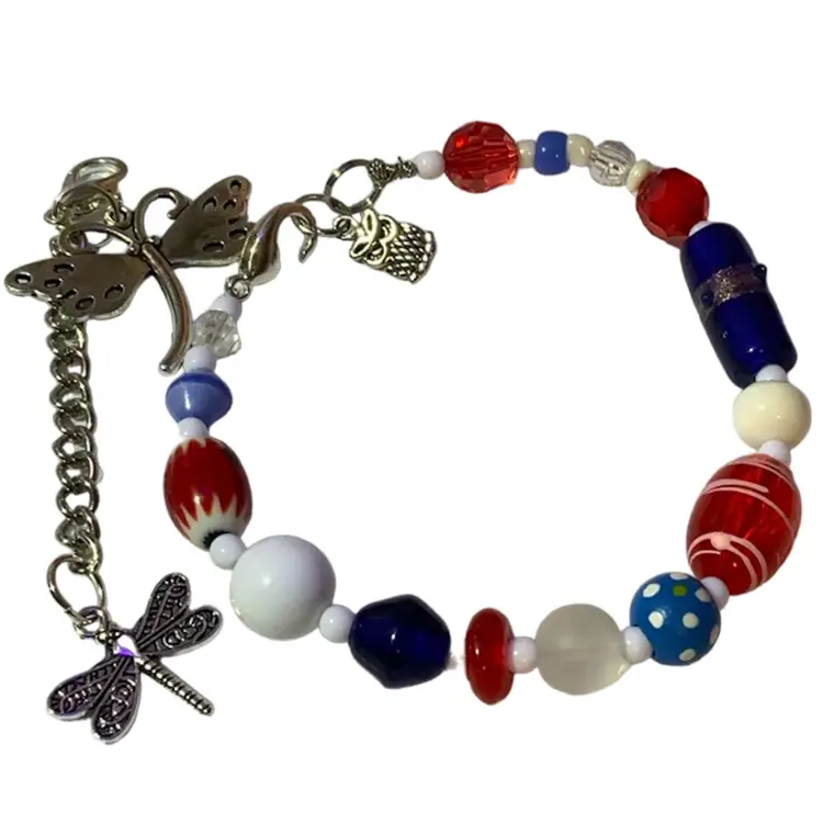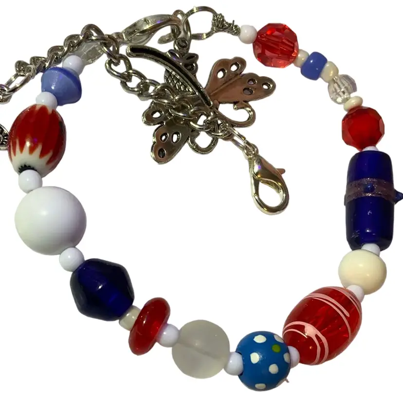 This is a new bracelet. Made by me, with a combination of vintage and new glass and acrylic beads. Approximately 6”-11”. Can be shortened, just message me after you purchase and before I ship.