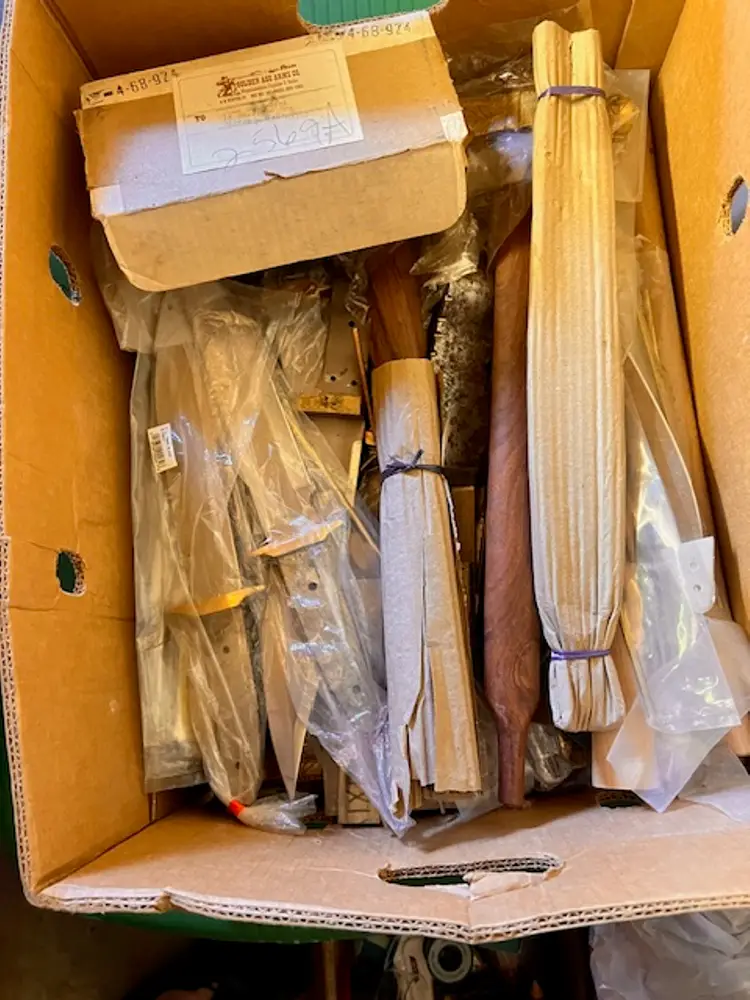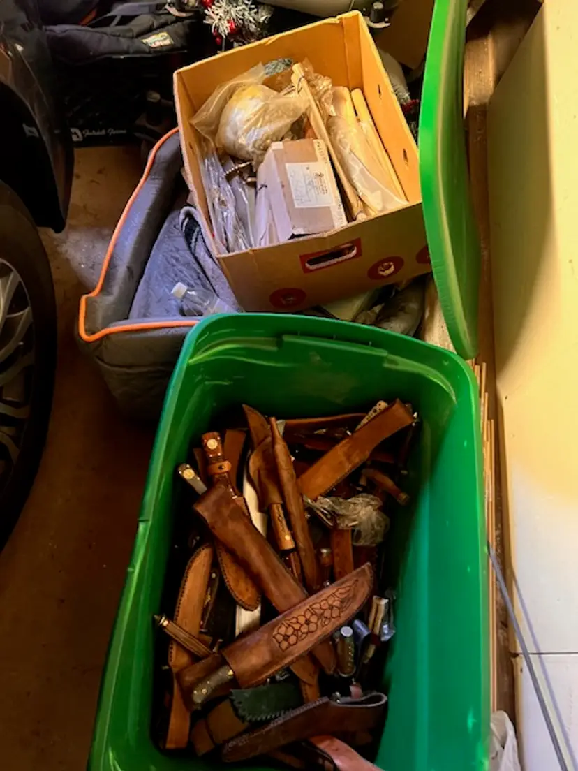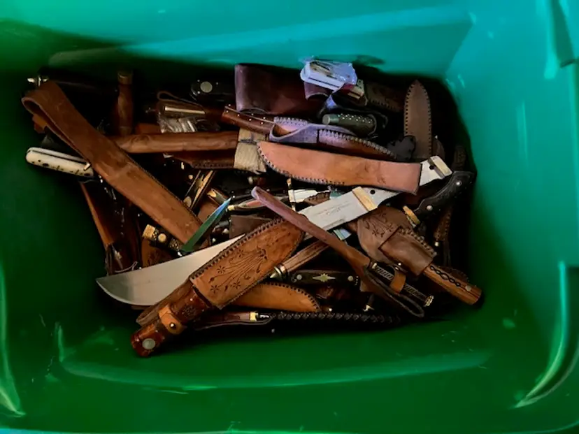 One of our customers gave this to me to sell for my fundraiser. Her husband made them and recently passed away. In the green Bin are 38 handmade knives with sheaths he made himself. In the boxes are kits to make more and leather to make sheaths.