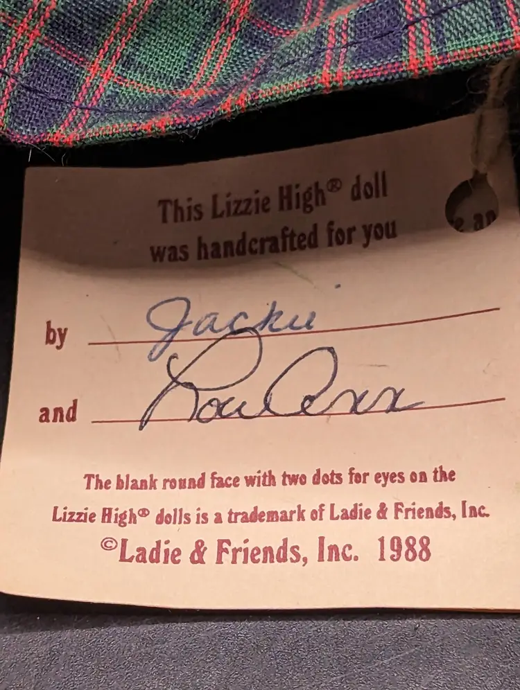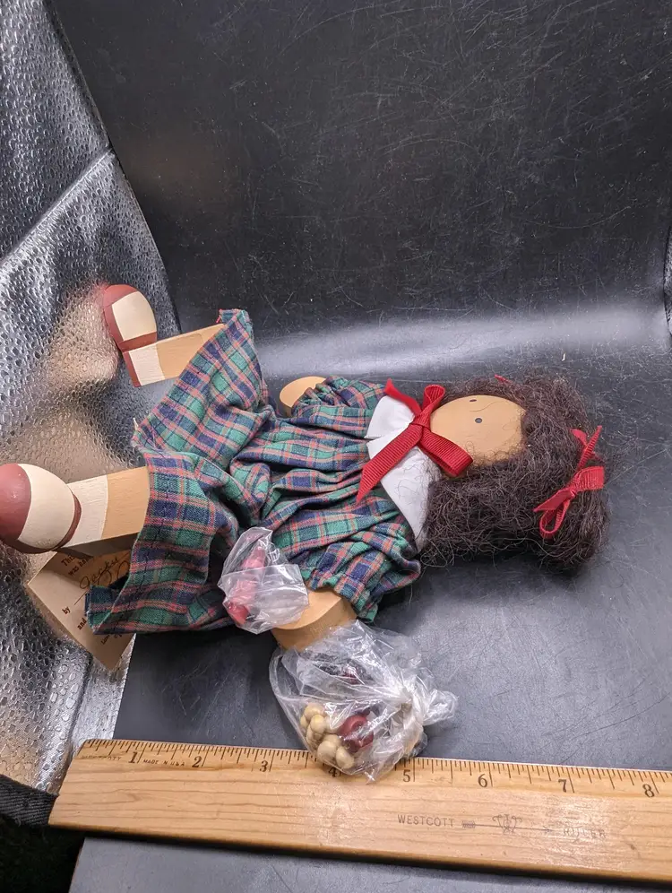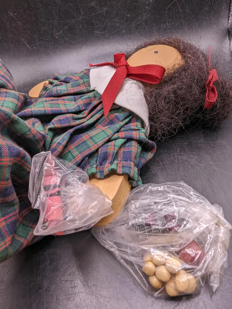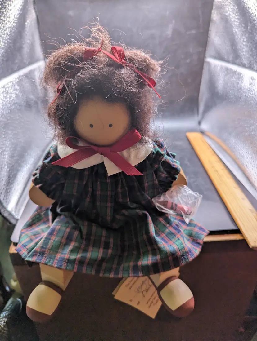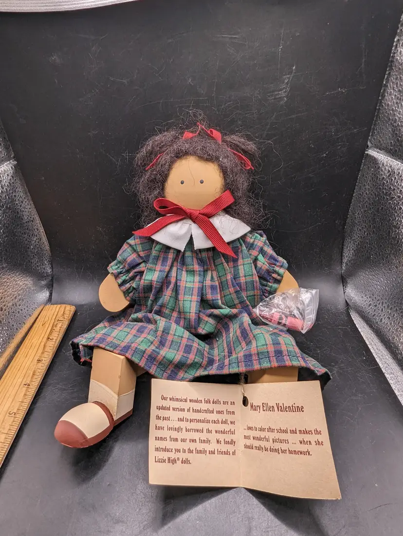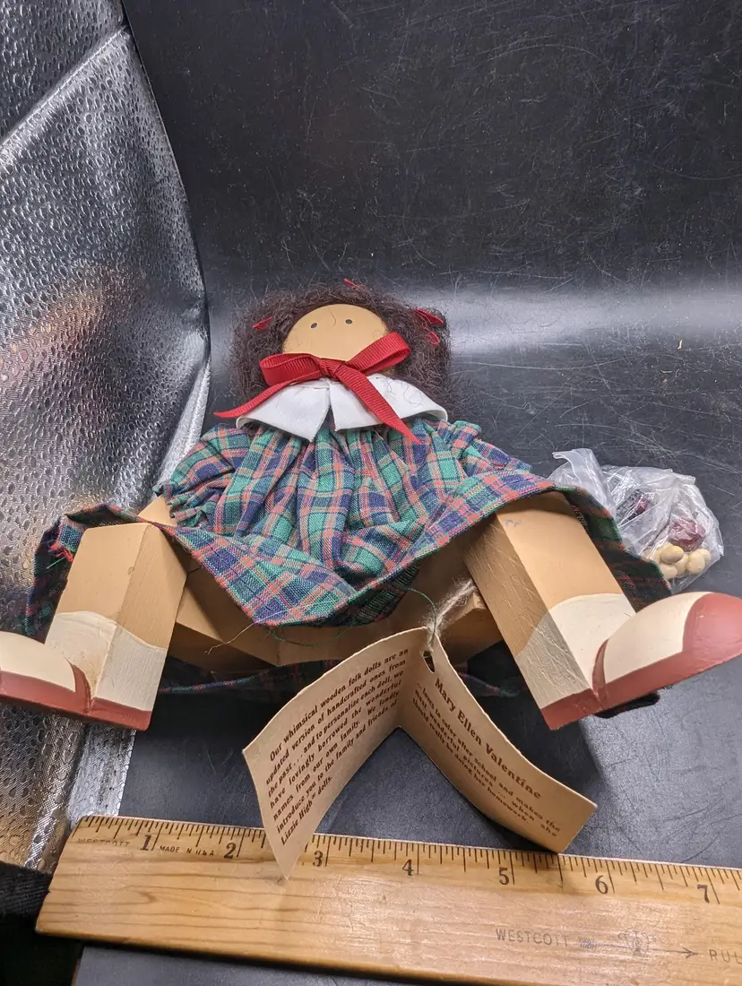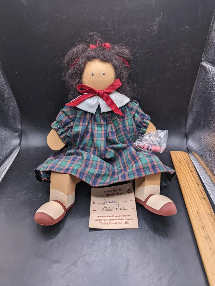 Adorable handcrafted rag doll featuring a charming plaid dress and cute red bows. Perfect for collectors or as a delightful gift for a loved one.