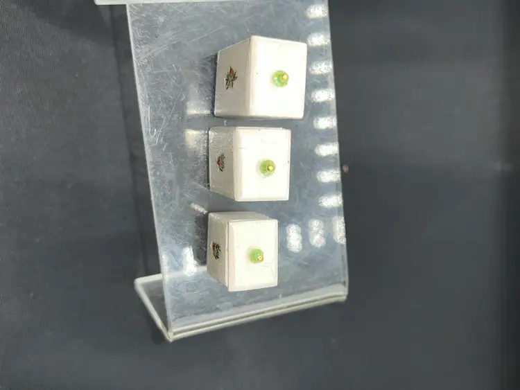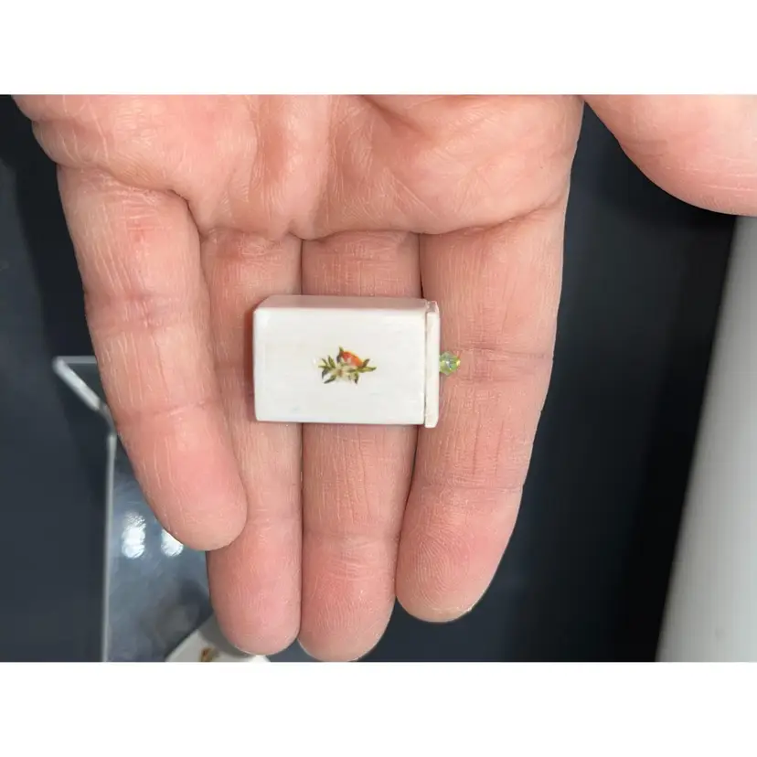 There are handcrafted by me, They are made out of wood & have a green crystal knob. They have a floral peach Decal. Each piece is unique no 2 alike . Miniatures are hard to get perfect do to size so expect some imperfections