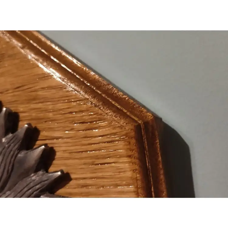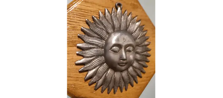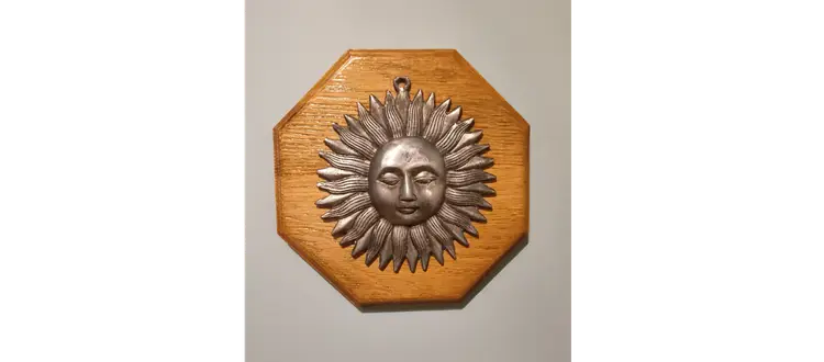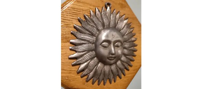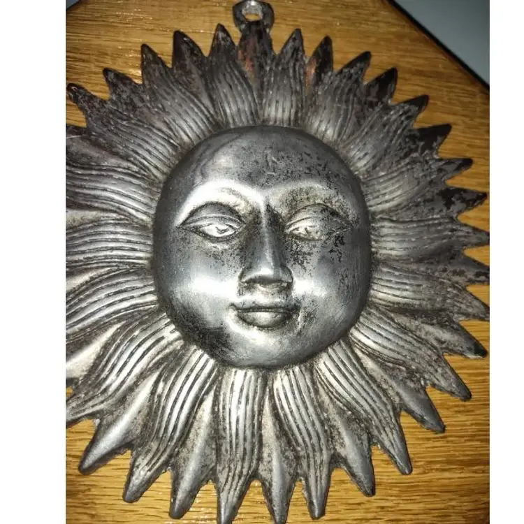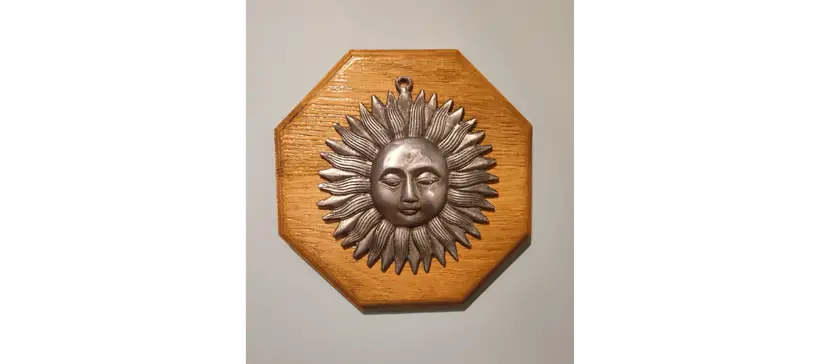 Bring a touch of vintage charm and rustic elegance to your home with this handcrafted wood sun plaque featuring a beautiful vintage metal sun. Perfect for any room, this unique piece of wall decor is sure to be a conversation starter and add warmth to your space. Material: High-quality Oak wood and vintage pewter sun Dimensions: 10" x 10" x 1" Weight: 2.13lbs. Hanging: Easy to hang with attached sawtooth hanger on the back. Condition: Brand new, handcrafted with love. The sun has some spots that are scratched this just adds to the vintage charm and is part of the art.