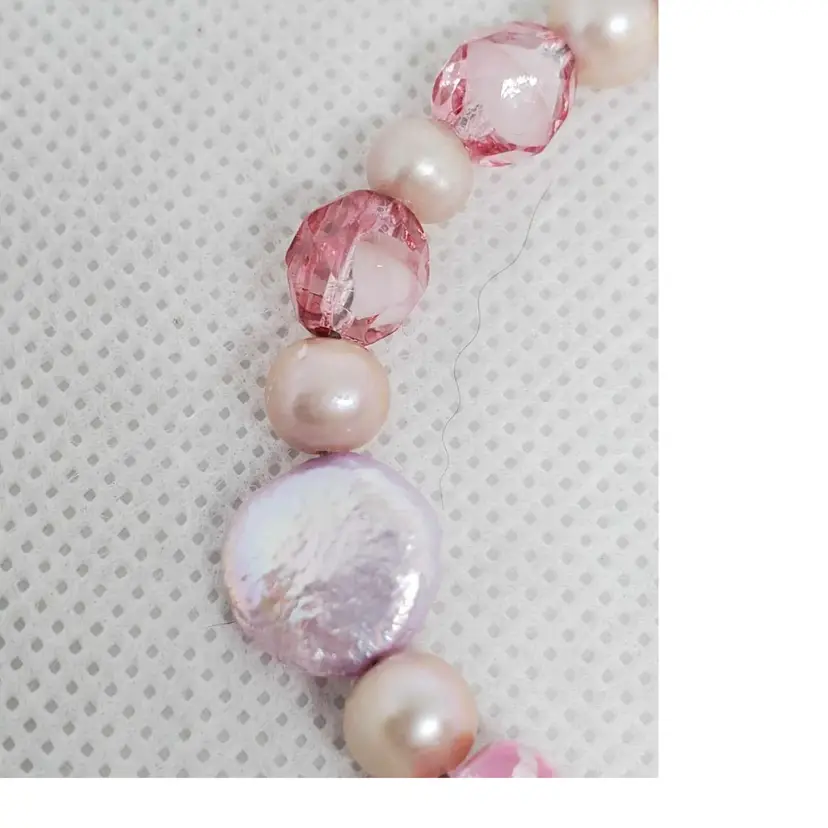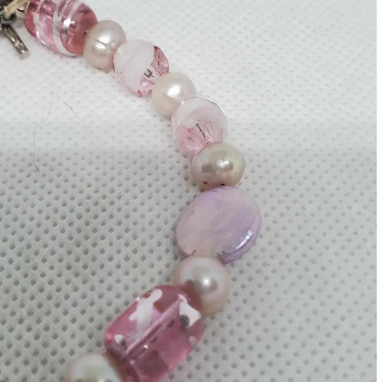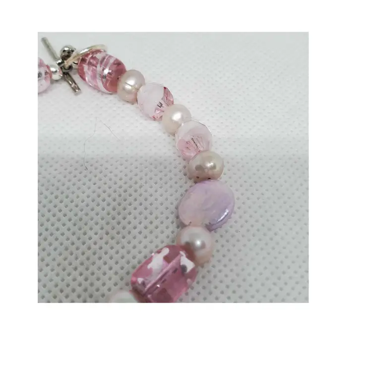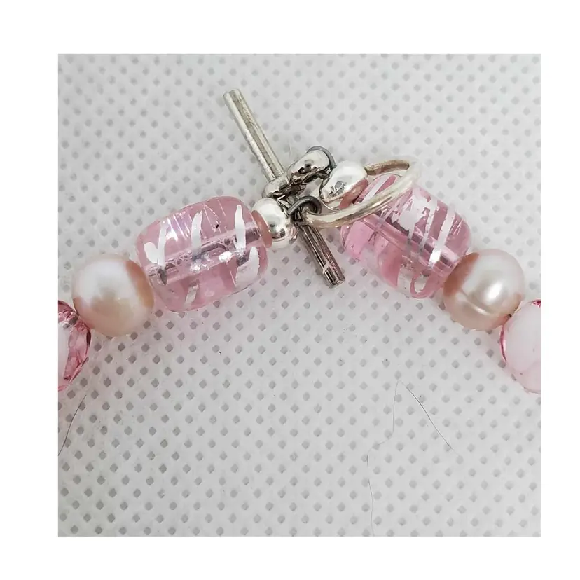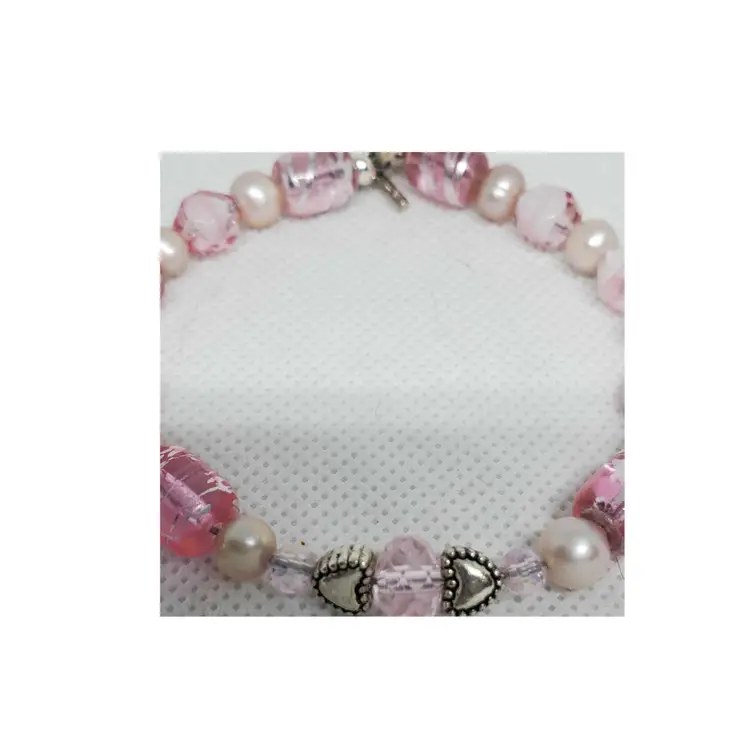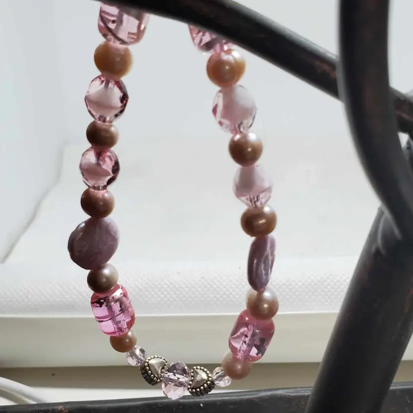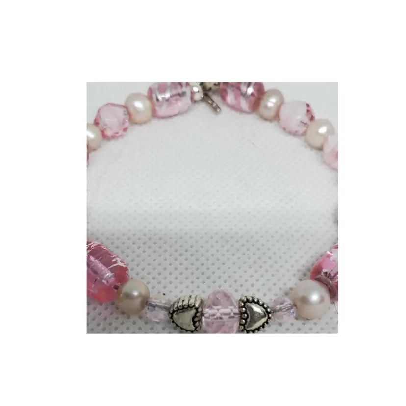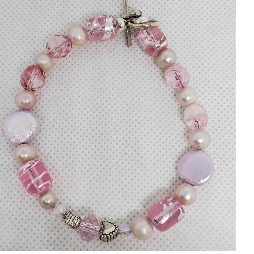 Elegant handcrafted bracelet featuring a mix of pink Czech glass beads,Lampwork and pearls, and a charming silver-tone heart charm. Perfect for adding a touch of romance to any outfit. 7”