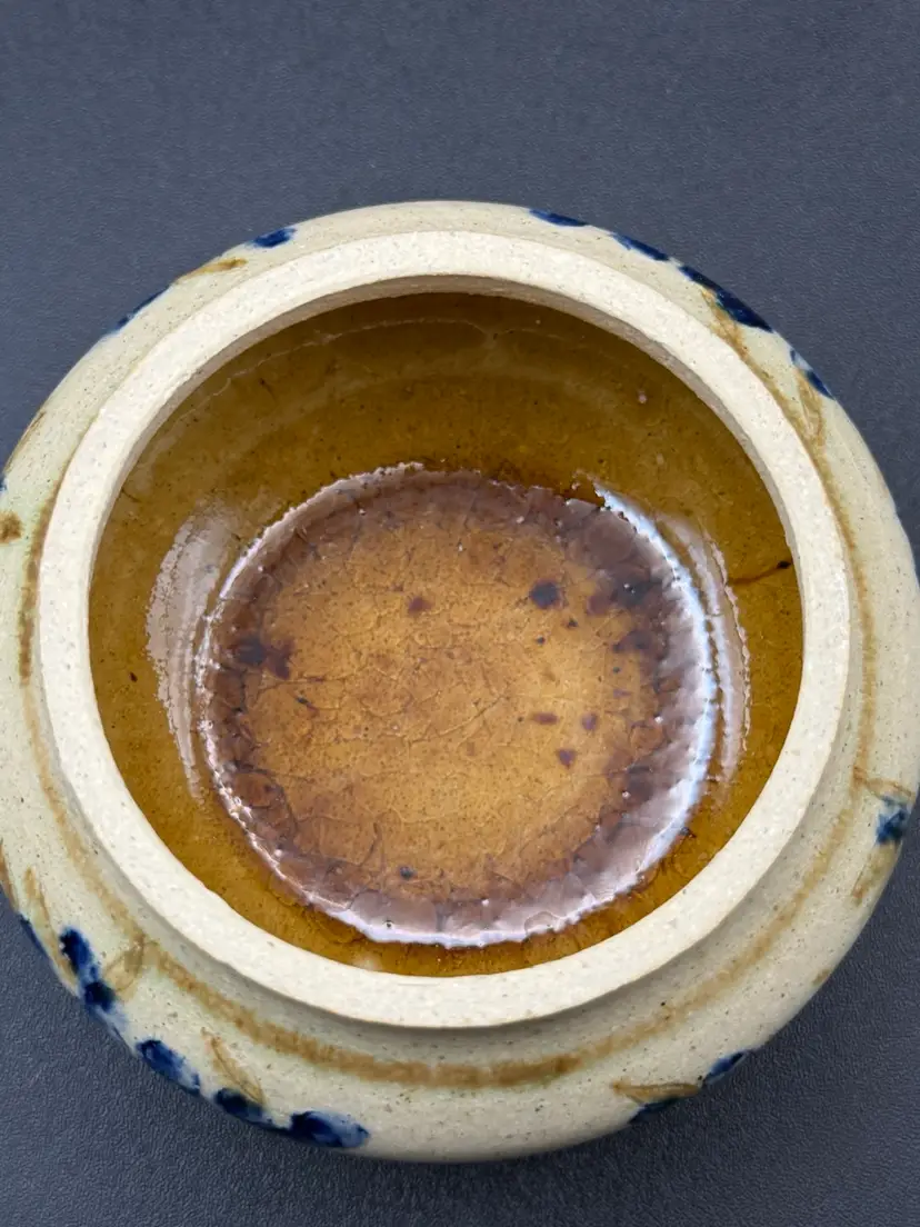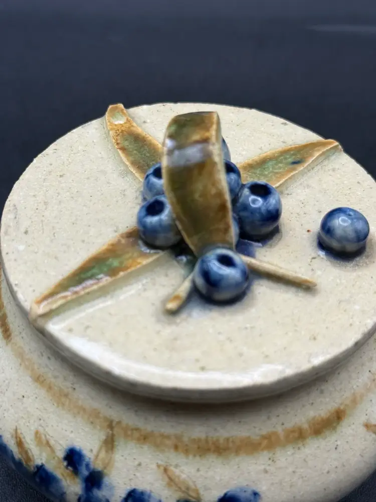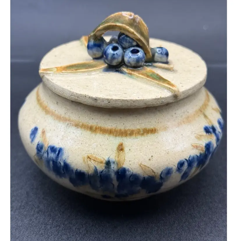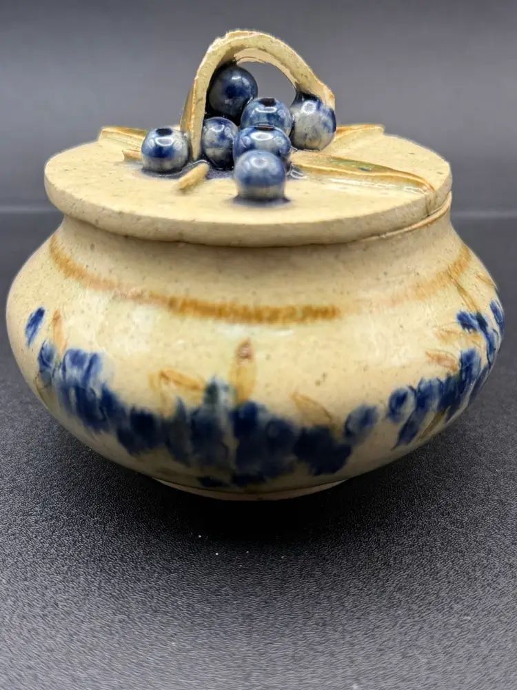 Awesome pottery for multi uses. Salt box, sugar jar or just trinkets. Decorated with blueberries and signed by potter Copley No chips or cracks 3” high About 4” round