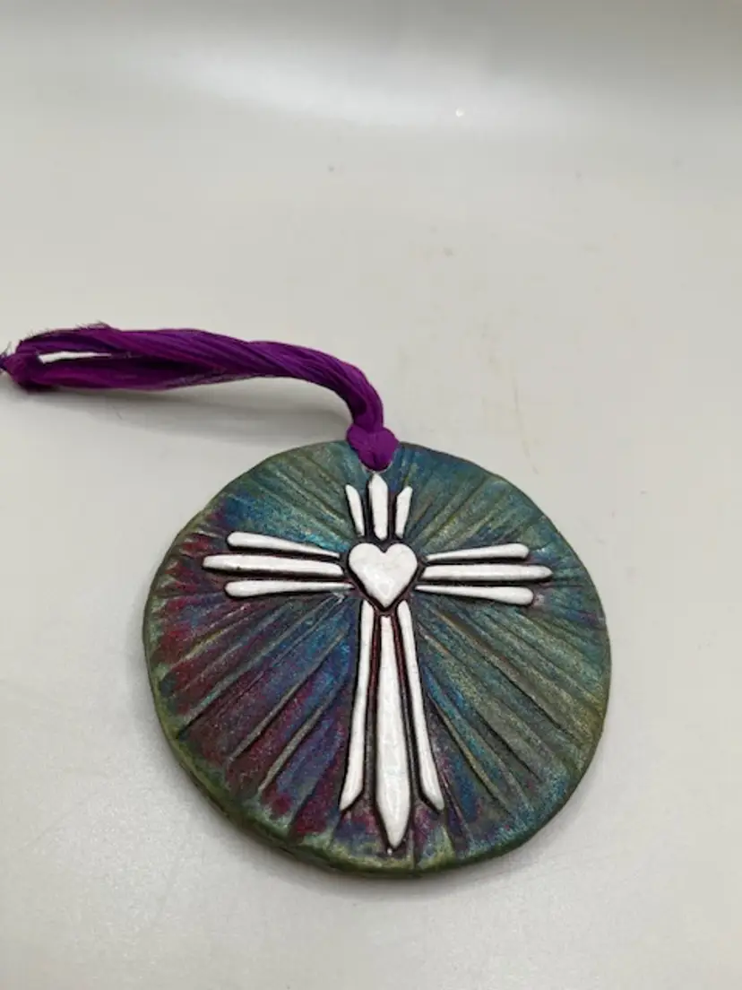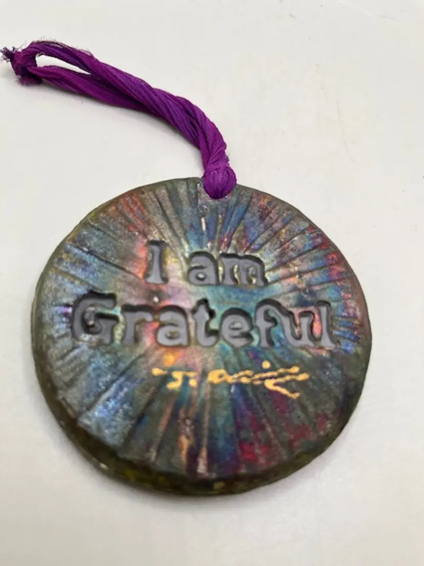 The reverse side of the ornament is engraved I am Grateful and signed by the artist, Jeremy Diller. This piece is unique due to the Raku firing process. The intense heat and subsequent reduction chamber creates unique, iridescent and metallic colors. Raku pottery is light sensitive and can fade in direct sunlight.