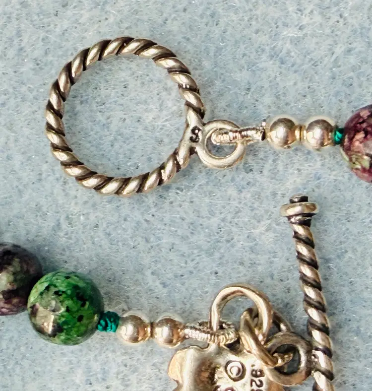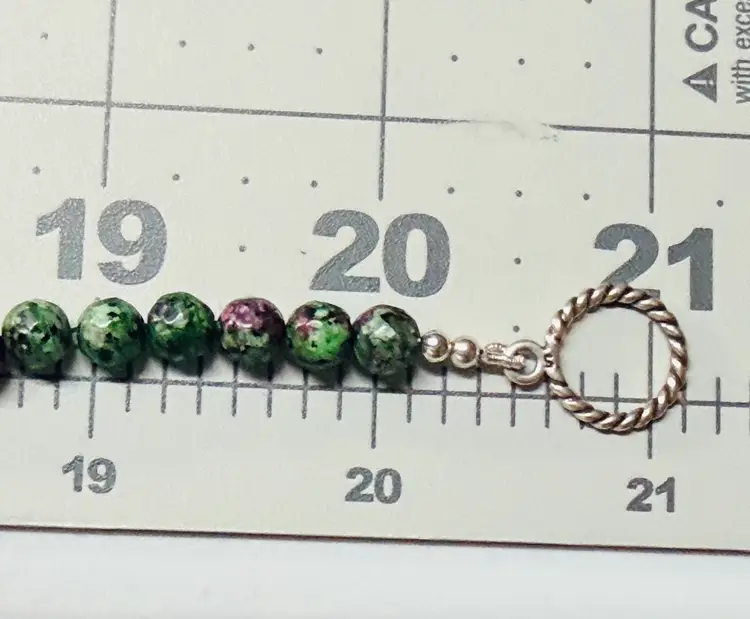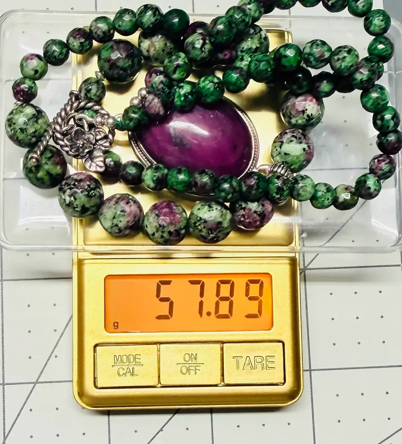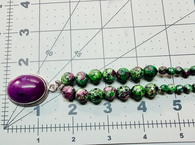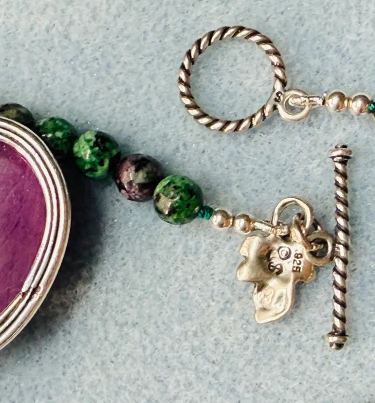 Handcrafted by me with genuine Ruby Zoisite Beads and Pendant as well as sterling silver toggle clasp. I ship purchased items within 24 hours except for weekends.