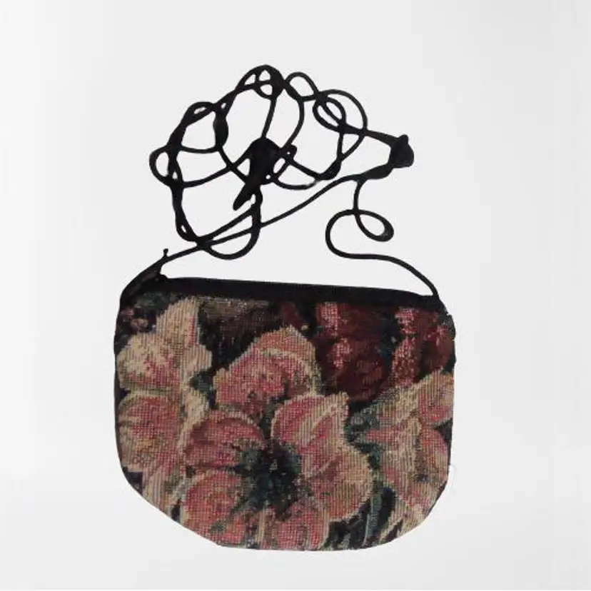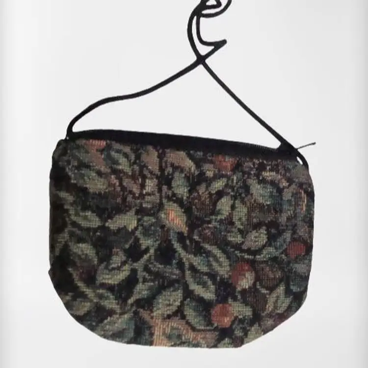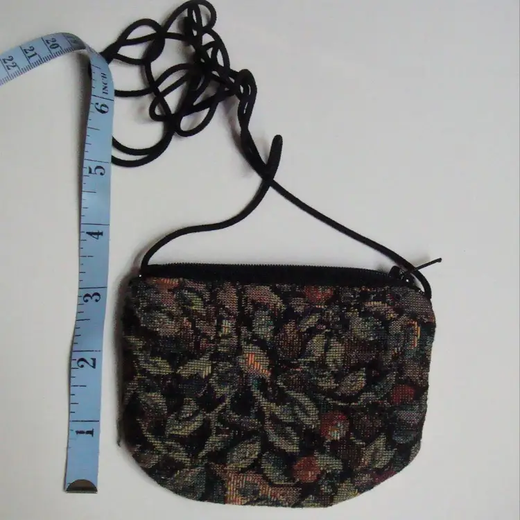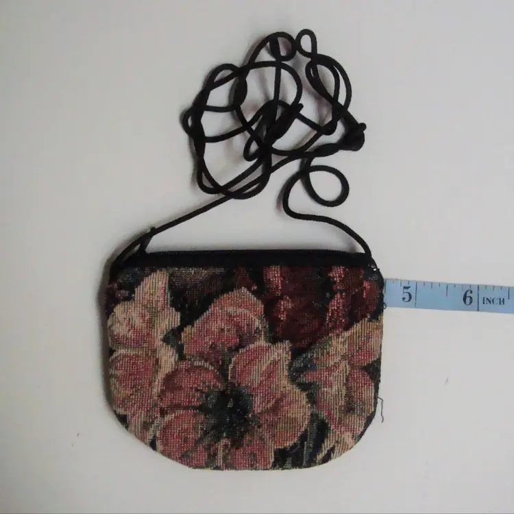 Handcrafted tapestry print mini zip pouch with long cord, wear crossbody. Lined interior floral print. 4.5" x 3.25" approx. 90s/00s Never used.