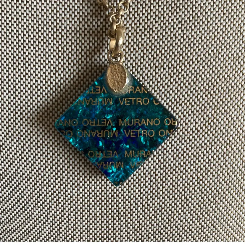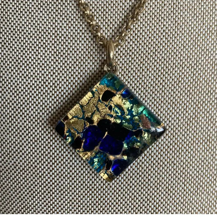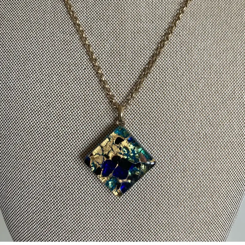 Handcrafted Murano glass pendant necklace. The pendant measures 1 3/8” across x 1 3/4” down. Marked Vetro Murano on the back which is the mark for an authentic piece of Murano from the island. It came without a chain so I just added a gold tone chain that measures 23” long. You might want to upgrade the chain.