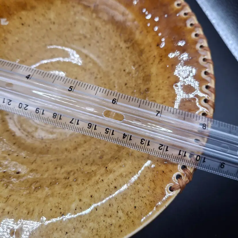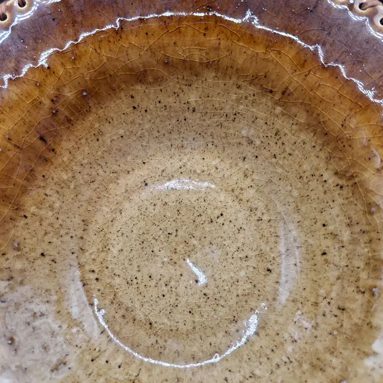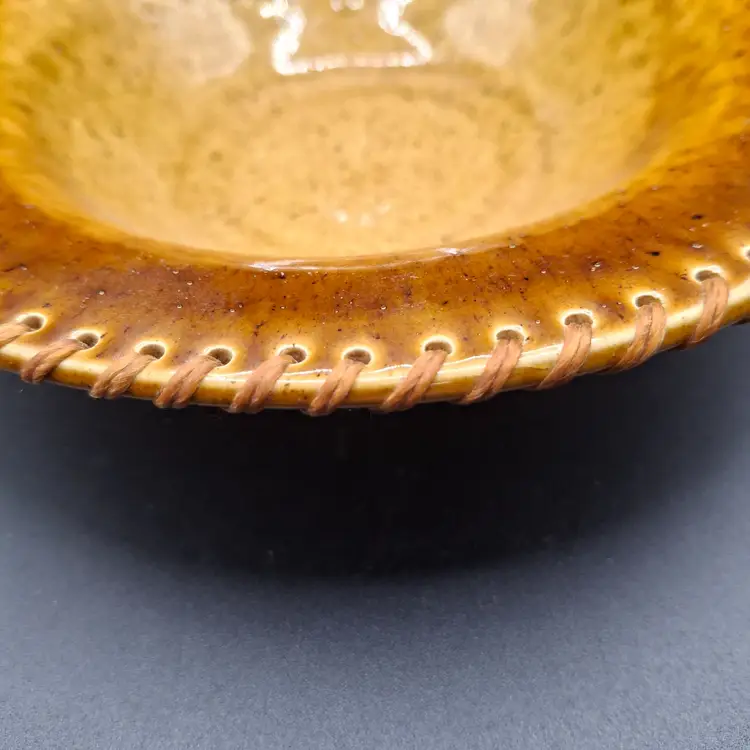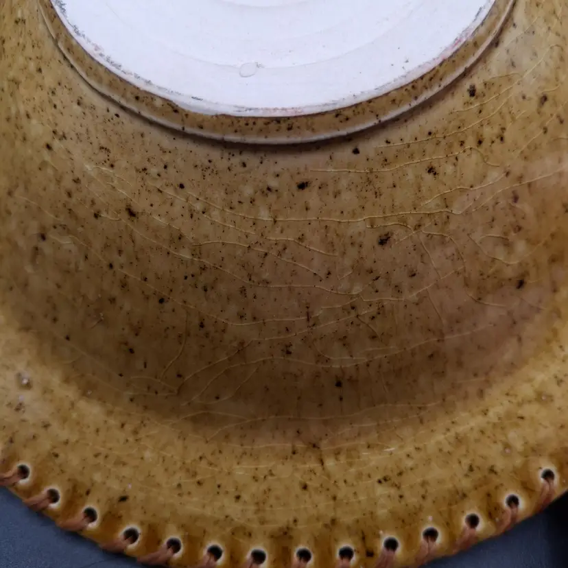• Hand-thrown ceramic construction • Intricate perforated rim detail • Organic speckled glaze finish • Distinctive mustard yellow coloration • Artisan pottery technique