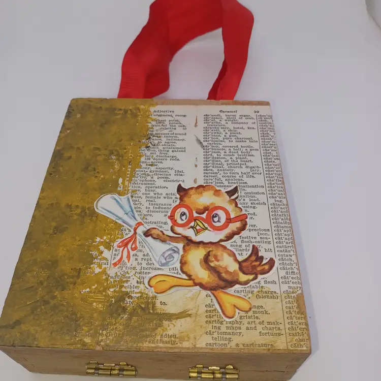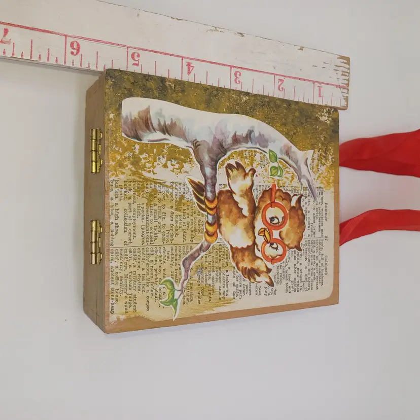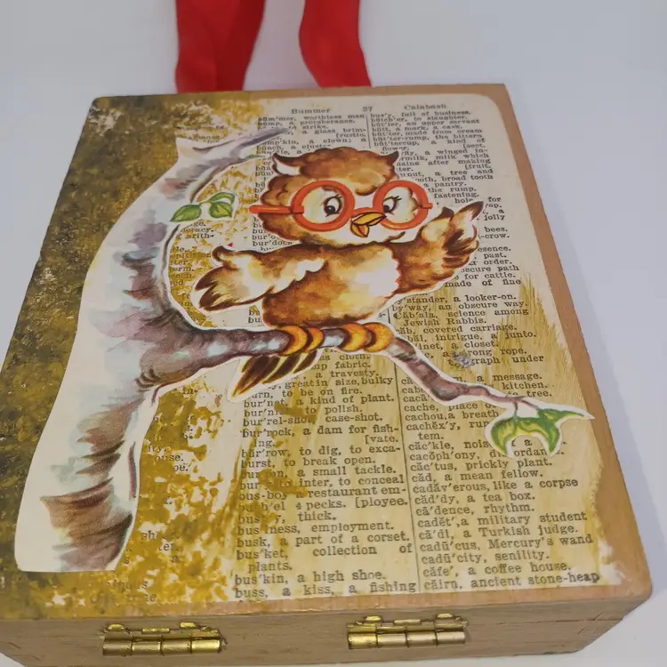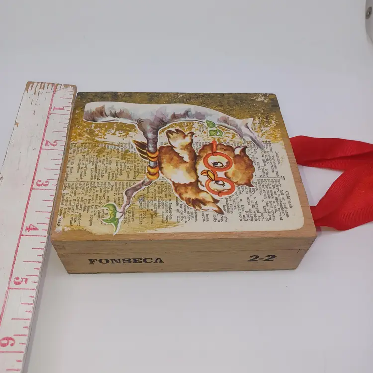 Charming handcrafted wooden cigar purse featuring a wise owl print on a vintage book page. A unique piece that adds a touch of nostalgia and literary charm Measures 5 1/4 in × 4 in Blue stripe fabric lining Please see all pictures as they are the best description. All items from a smoke-free home with pets. Experienced shipper
