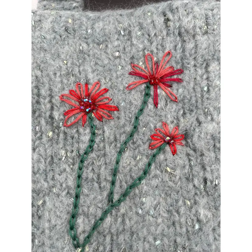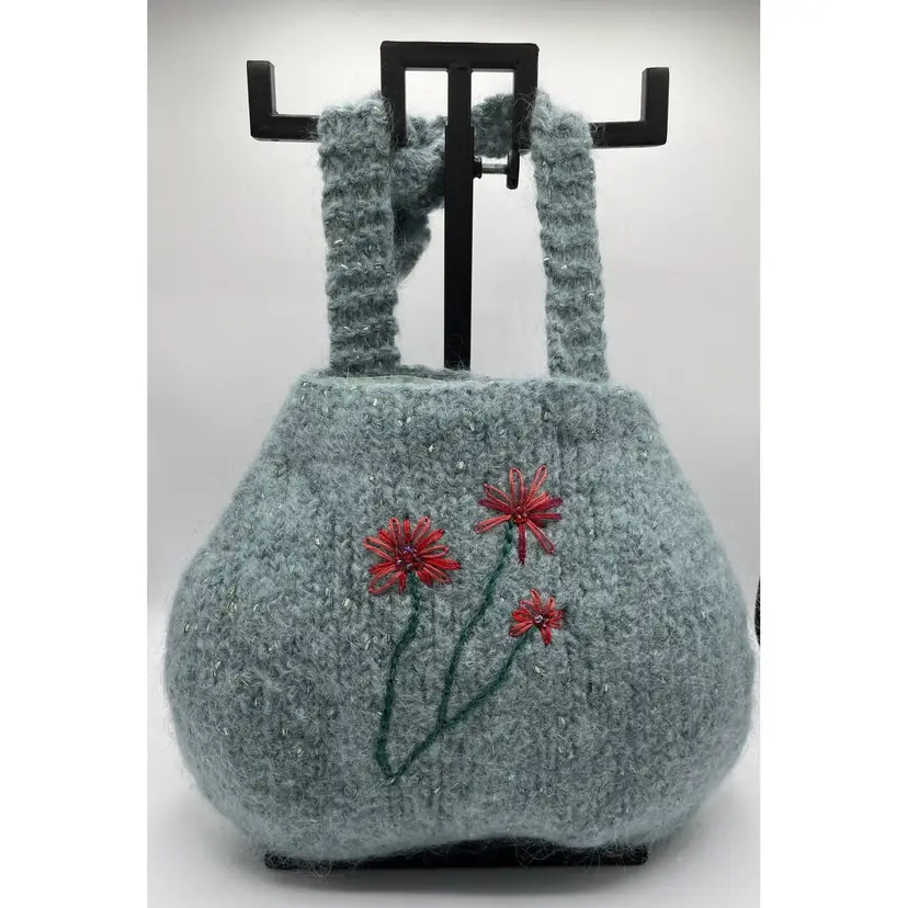 Knit from 100% alpaca wool with novelty yarn worked in. Hand embroidered and beaded, cotton lined. 13" W x 11" D with 21" strap.