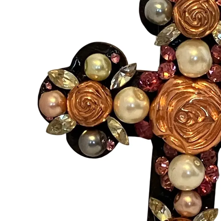 I just started making these beautiful crosses just in time for Christmas! This cross is made from a wood base that measures 4” x 2.5” and has a mixture of new and vintage beads and rhinestones applied with glue. Just the right size for a Christmas tree or can be used as a small wall cross.