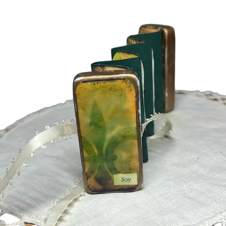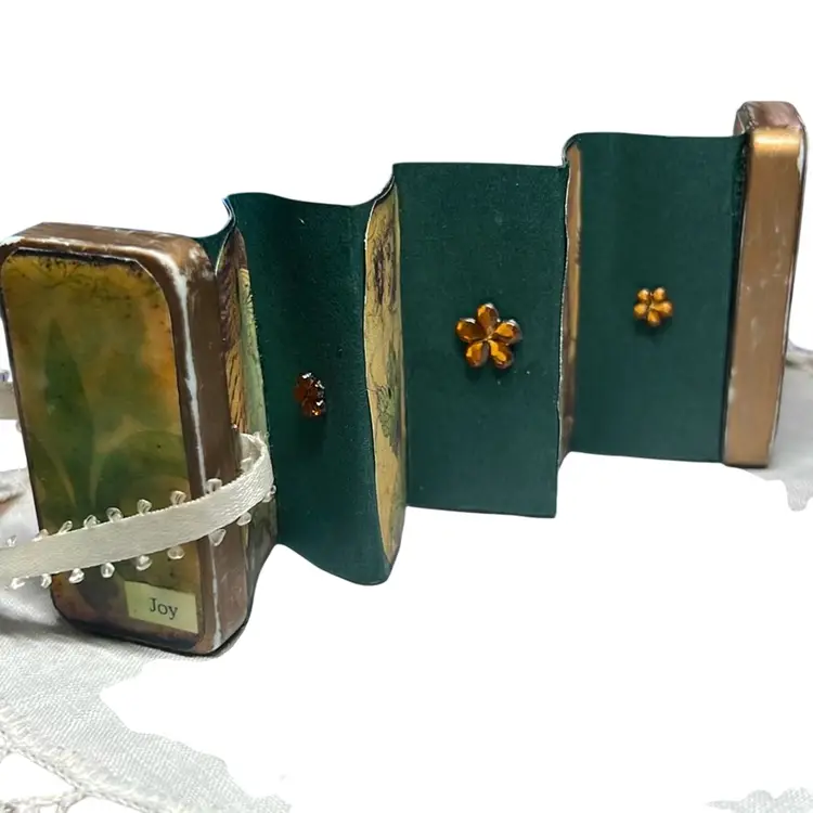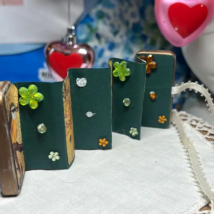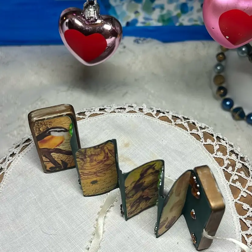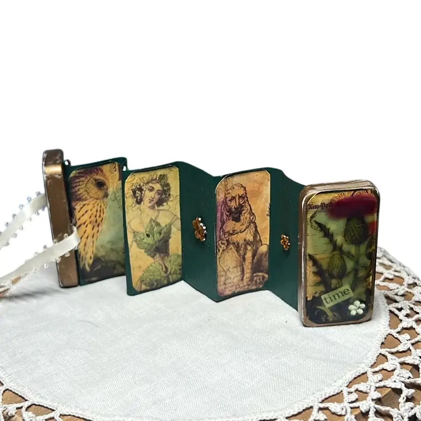 Very unique piece, has vintage pictures and little jewels Decorating a fold out style. Pictures on both sides. Front and back have a resin/acrylic type coating. Measures 4.5” long & 2” tall