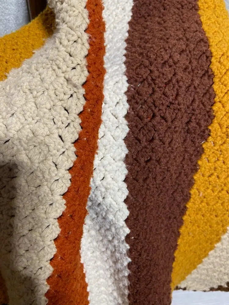 This is a handmade Afghan lap throw with a striped pattern and multicolor design. It measures 60 x 48 inches and is perfect for use as a chair throw.