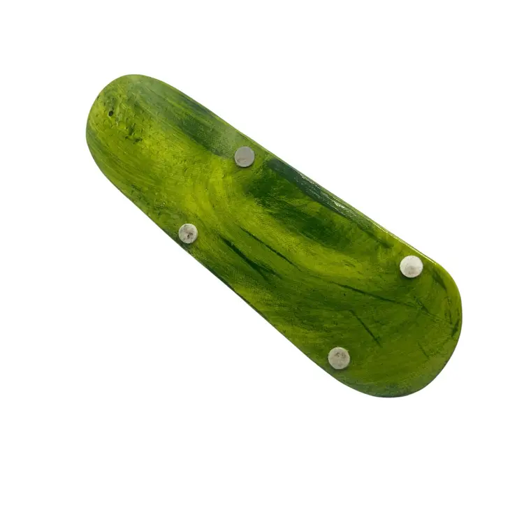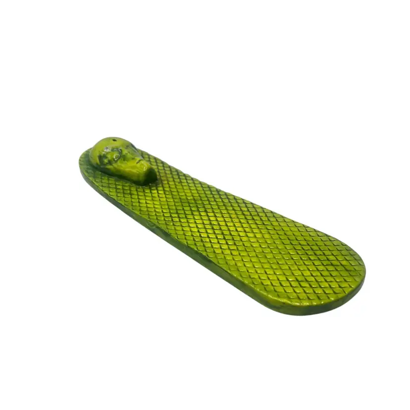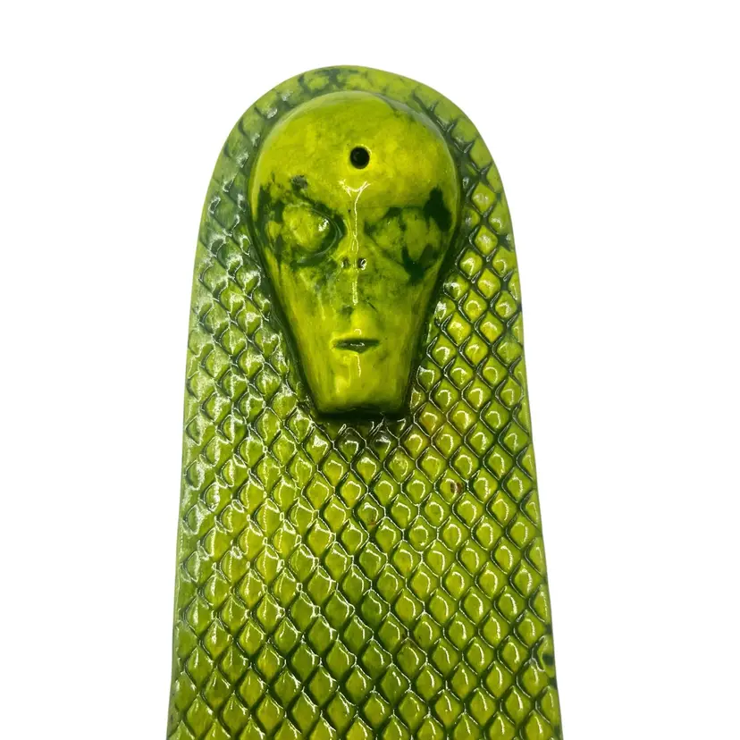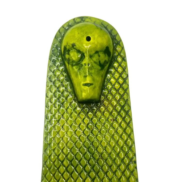 Unique and whimsical handmade pottery incense holder featuring a sculpted alien head design at one end. The tray is hand-painted and glazed in green tones with a textured surface, designed to securely hold incense sticks while catching the ash. • Size: approx. 9” long • Material: Hand-painted and glazed pottery/ceramic • Design: Alien head motif with textured tray surface • Condition: Excellent preowned handmade piece. No chips or cracks. Four round felt pads have been applied to the bottom to protect surfaces.