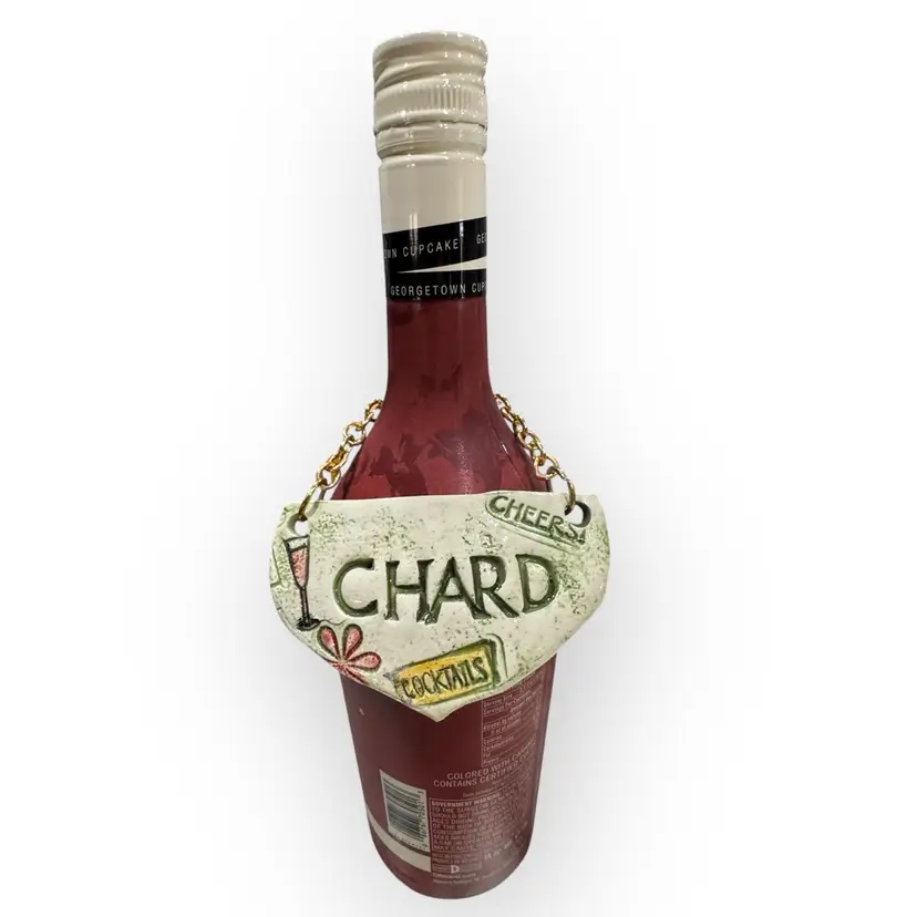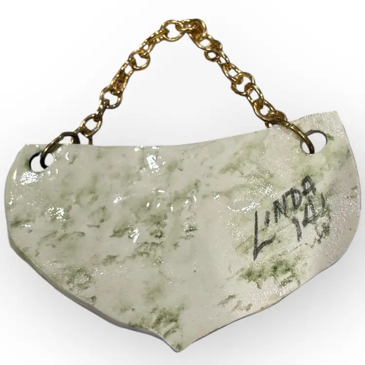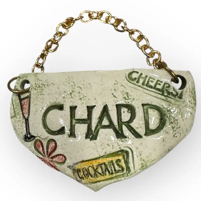 Handmade ceramic hanging wine tag with gold chain, slightly curved to hang against the bottle. Specifically for a bottle of Chardonnay, the tag is signed by the maker on the back and includes the year it was made.