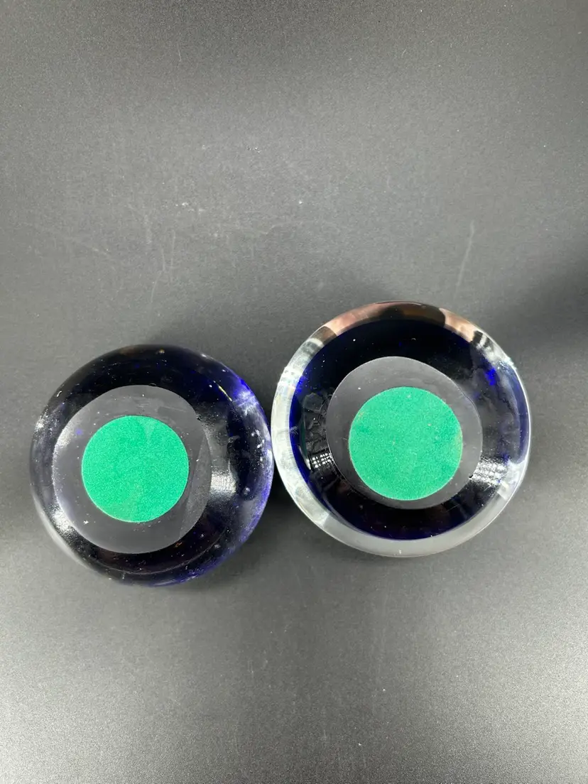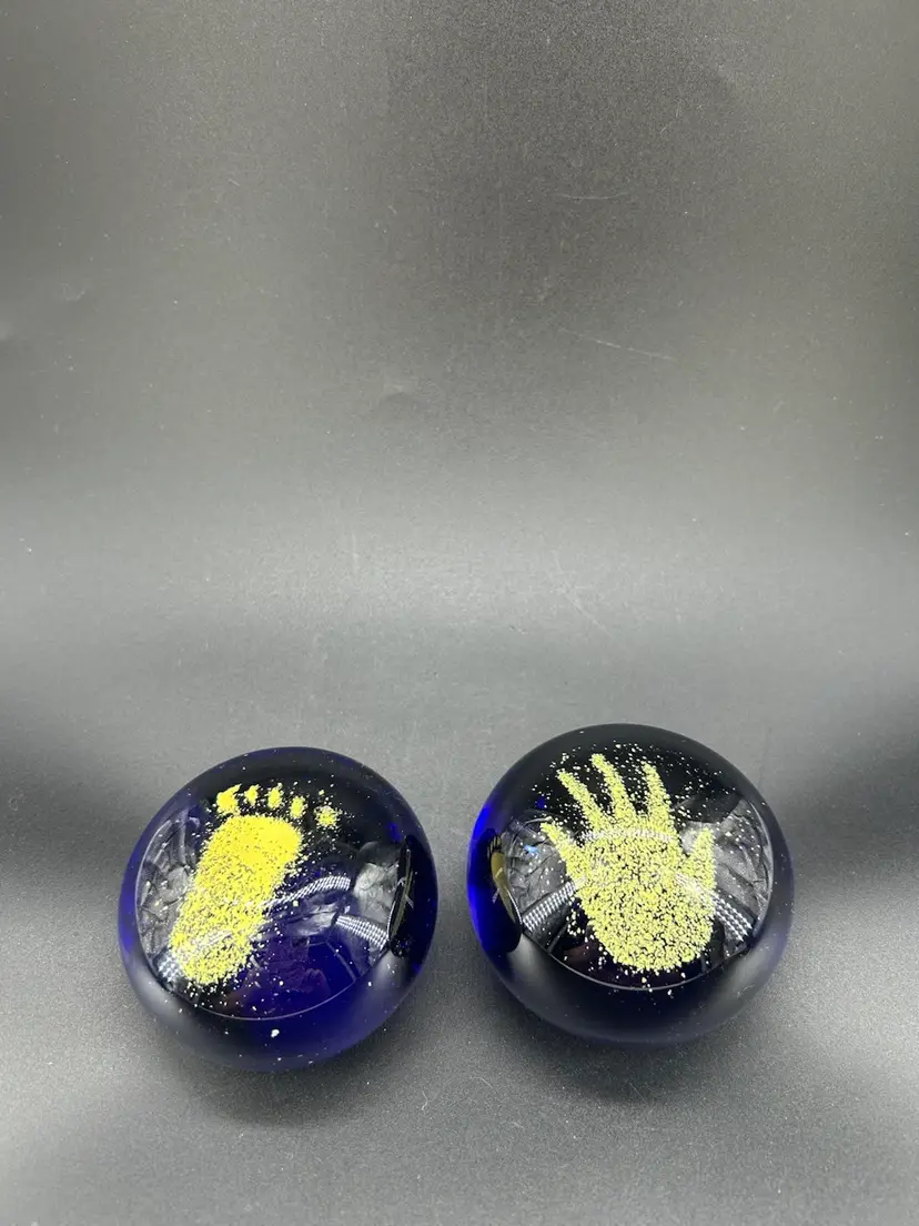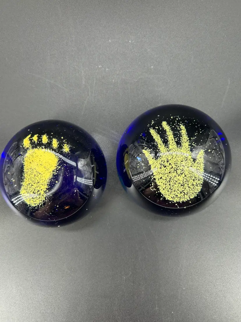These are art glass paperweights with glittery handprint and footprint embedded in cobalt blue base. Each one stands approximately 2 inches tall and about 3 inches across. There are no chips, cracks or bruises.