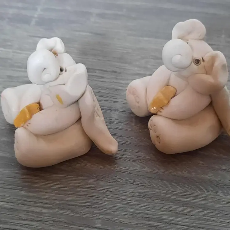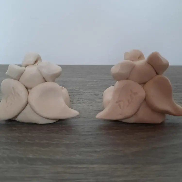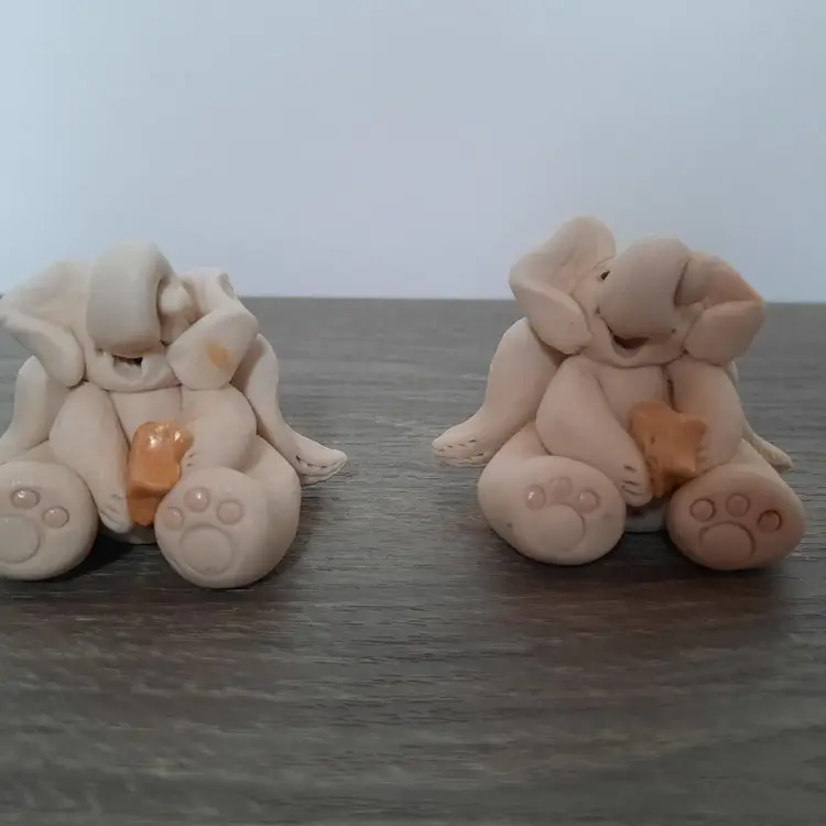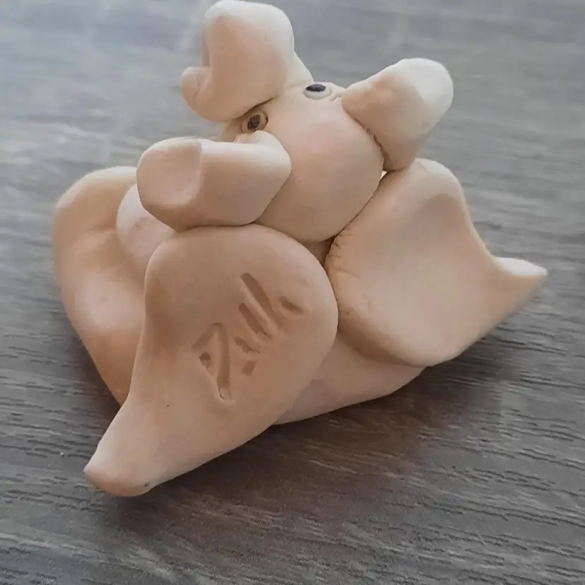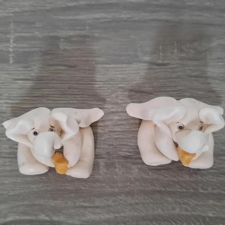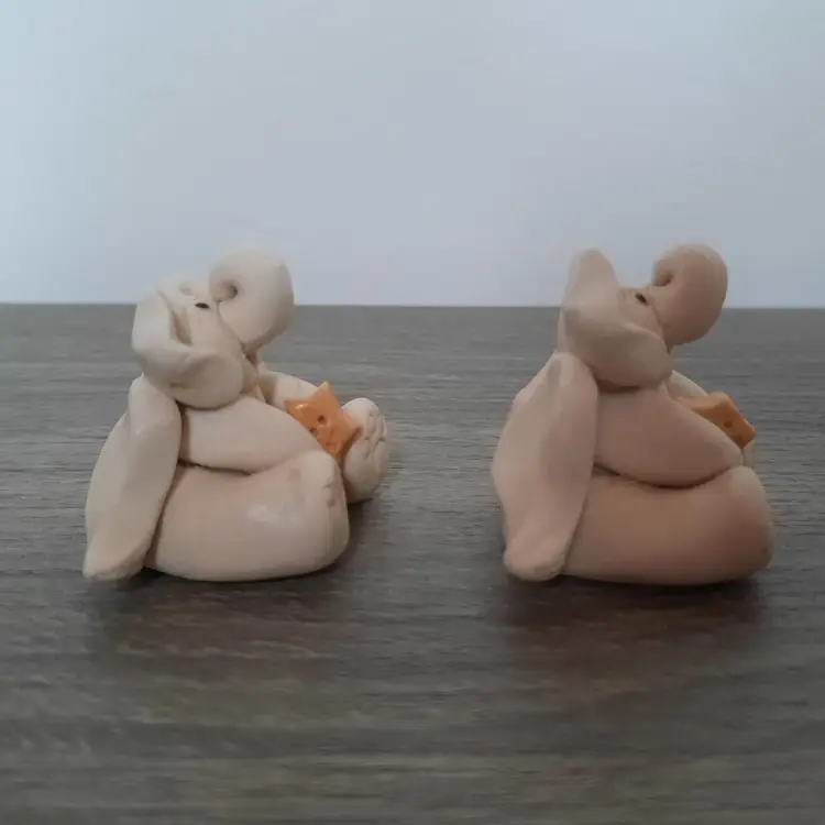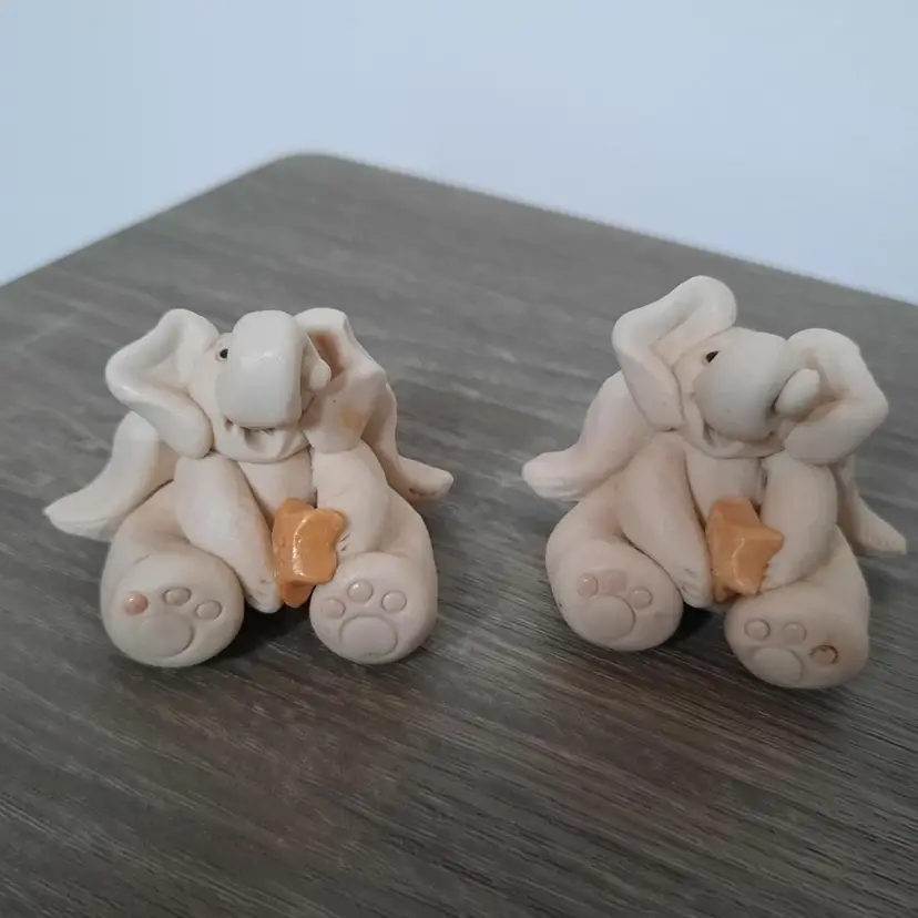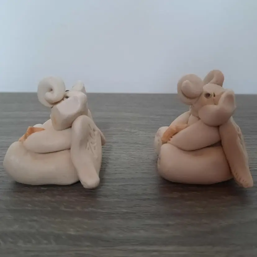 Adorable pair of clay pottery miniature elephant angels. Each is handmade, so slight differences gives them their own unique look. Details are outstanding, including foot prints, belly buttons, curled trunks, feathered wings and holding smiling golden stars. Each signed by artist on the back of the wing. Measures approximately 2" long x 1.6" high. In excellent condition.