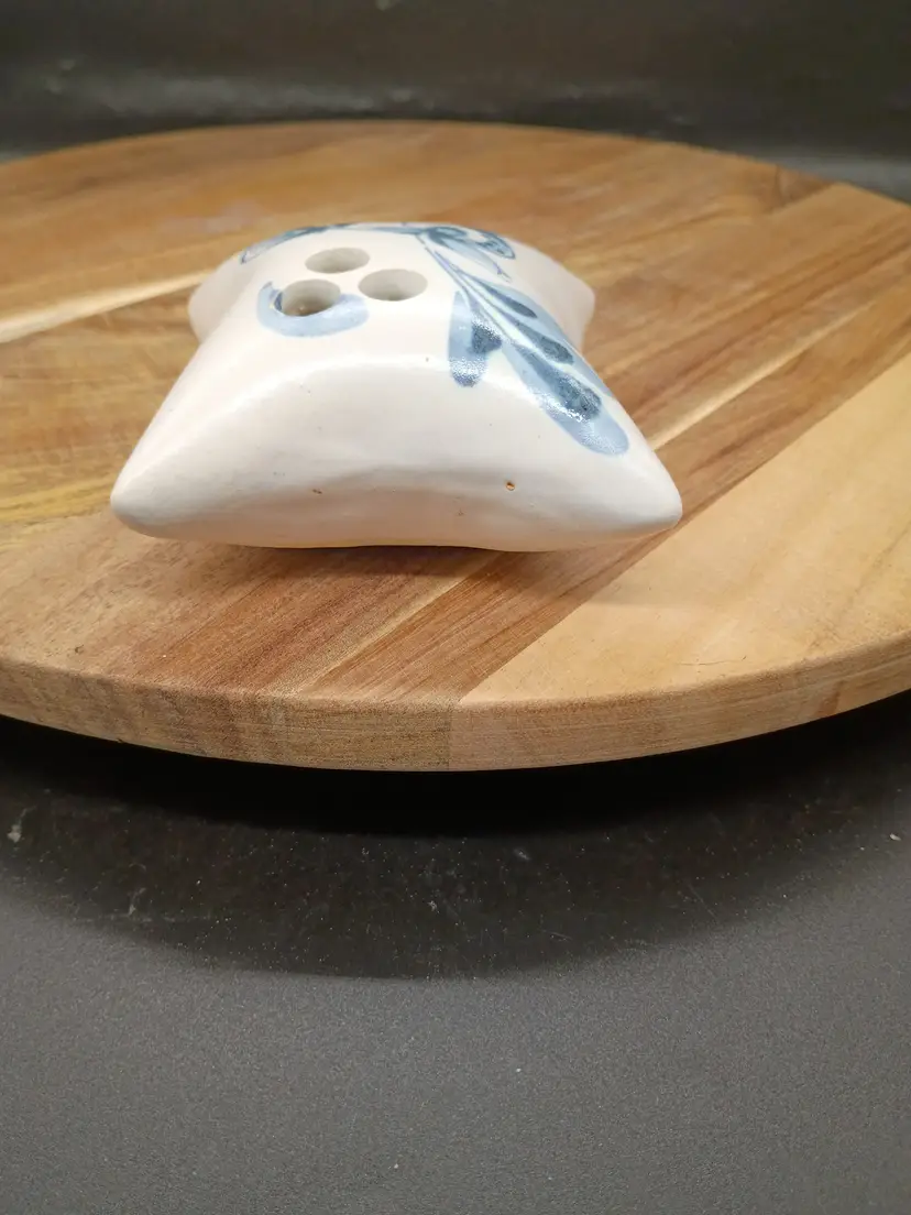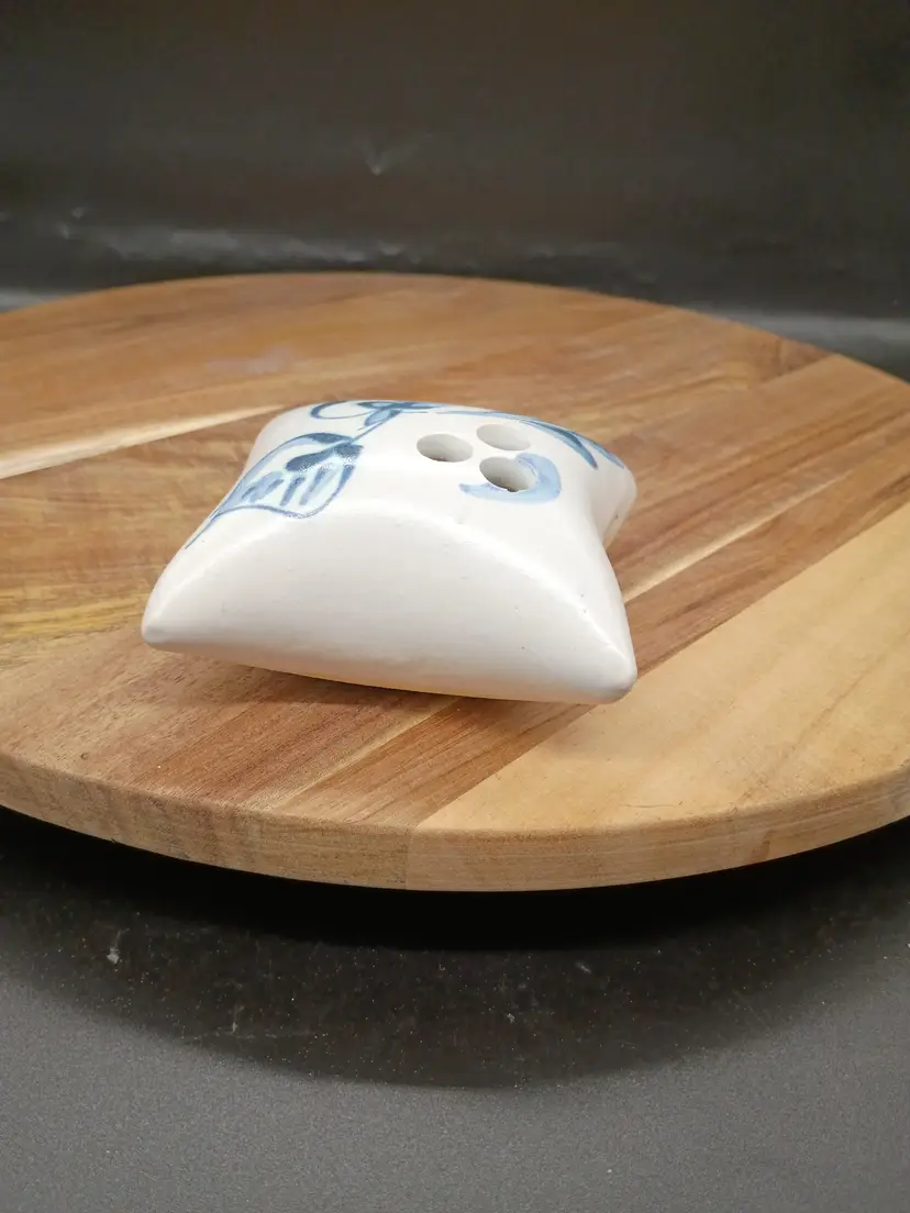 Handmade Art Pottery Pillow Style Floral Frog Ikebana Vase 3 Hole White with Swirled Blue Design Signed Davis. Circa 1990-now. This is 3.5 inches long & wide and about 2 inches tall. This is preowned, No Chips Cracks or Flea Bites, Glaze intact no staining Excellent condition. Ships USPS