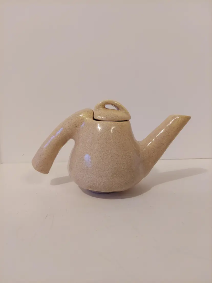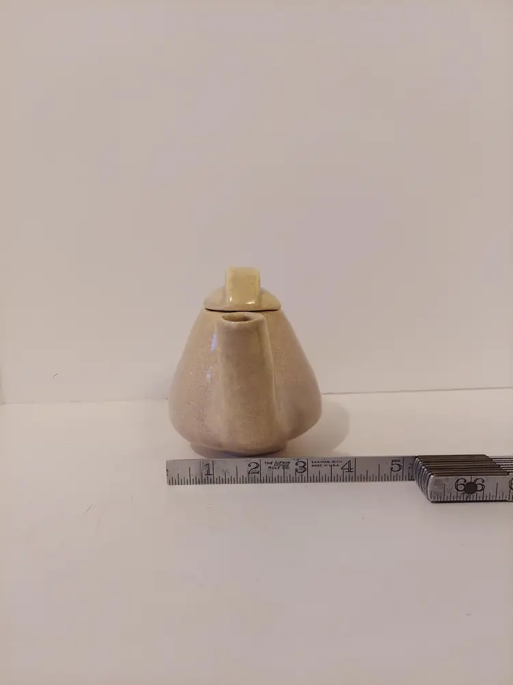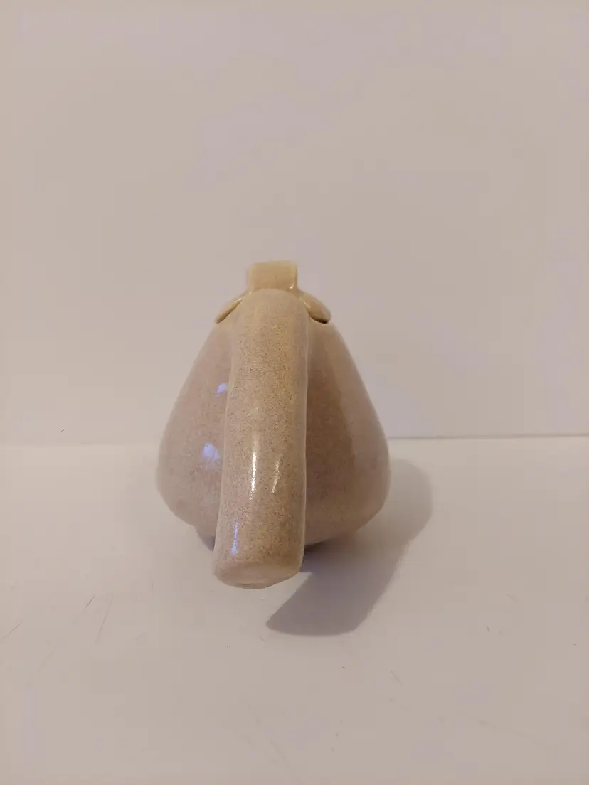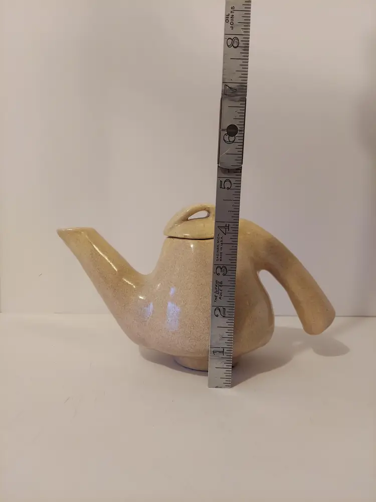 This hand built teapot measures approximately 8×4.5×3.5 inches. It has the artist's initials on the bottom.
