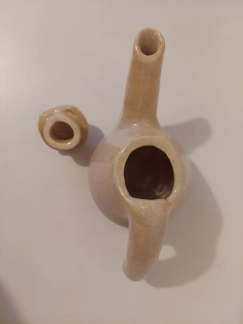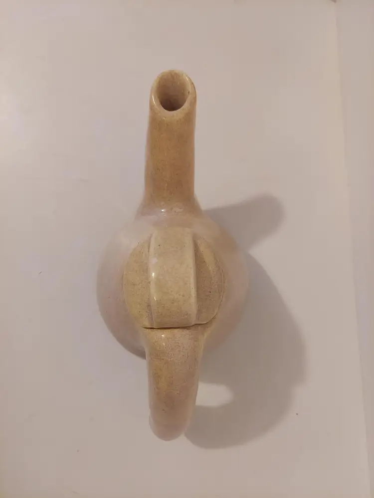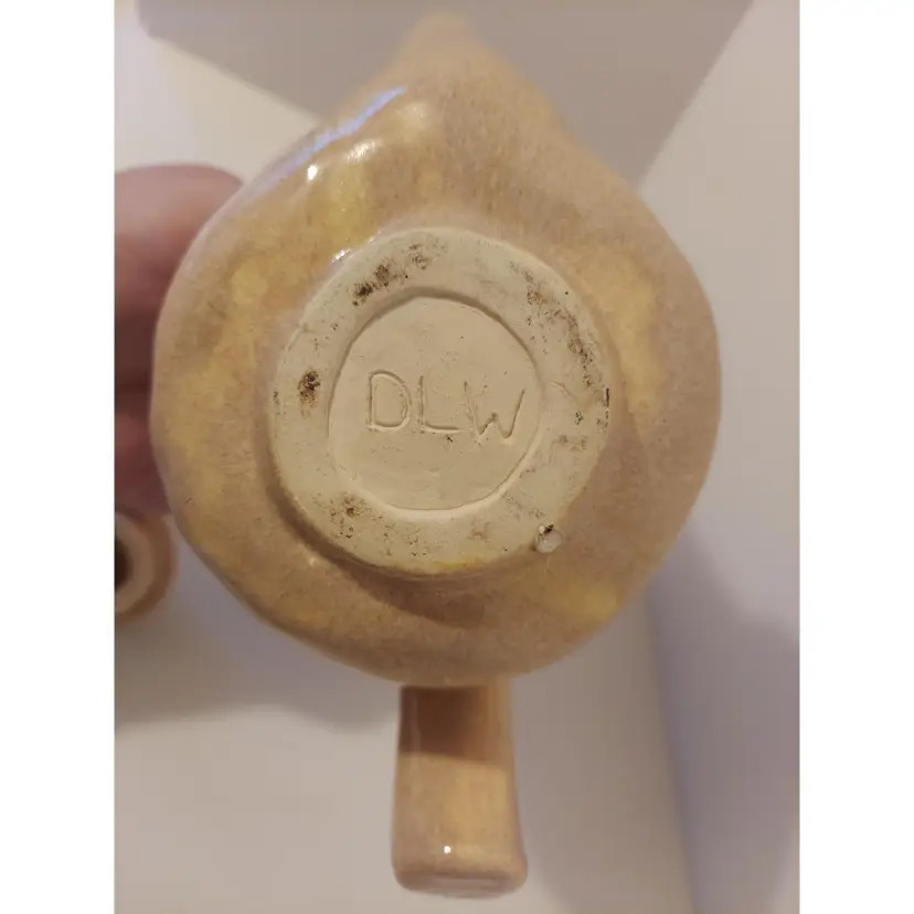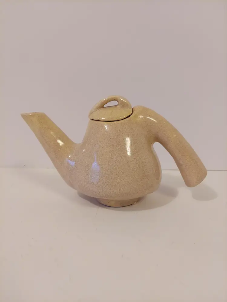 This hand built teapot measures approximately 8×4.5×3.5 inches. It has the artist's initials on the bottom.