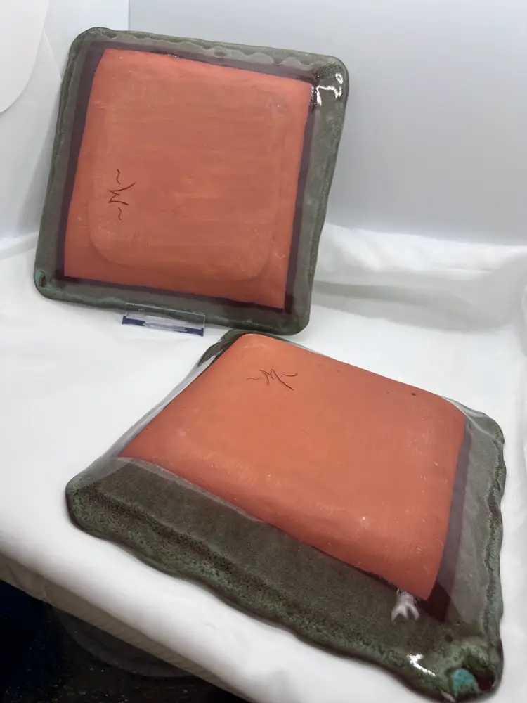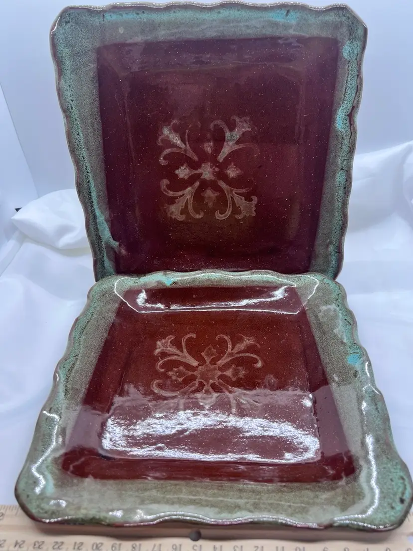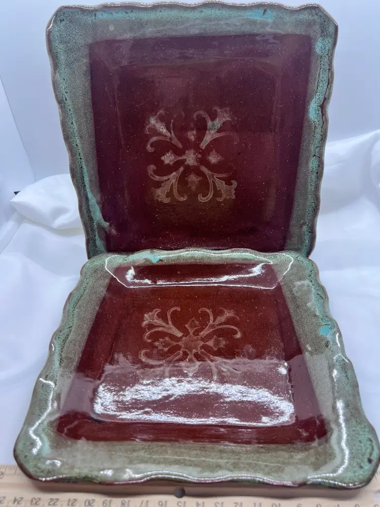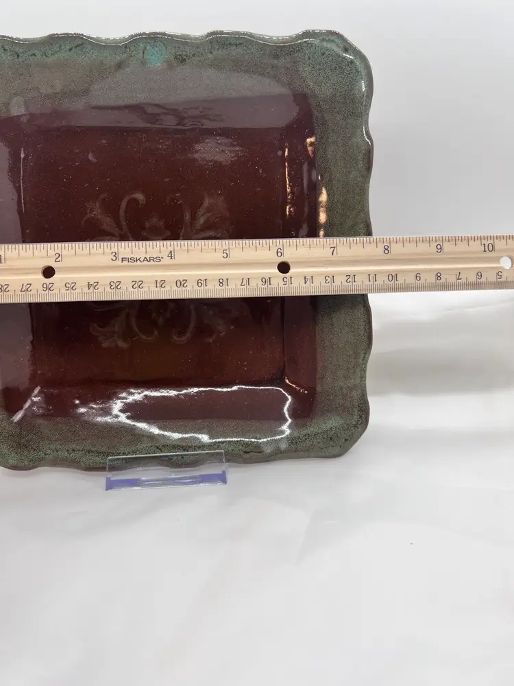 8 x 8" handmade art studio square plate. Brown glaze with layered aqua glaze on decorative cut edge with center design.