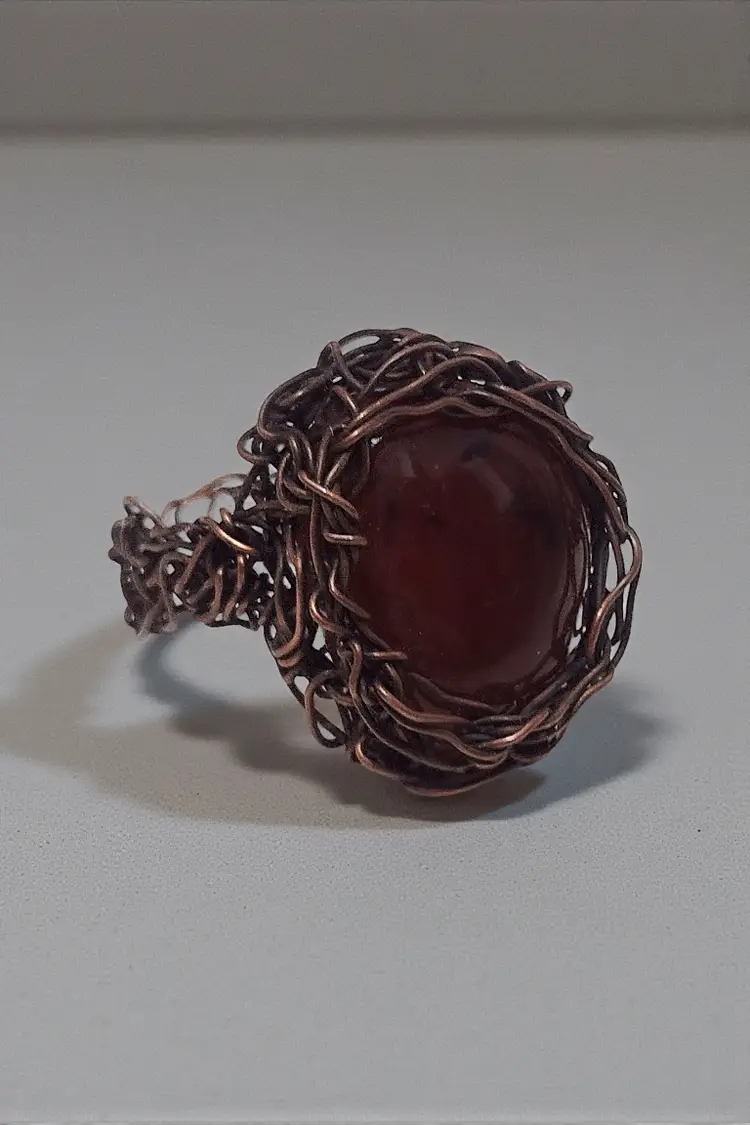 This is a very nice handmade ring with a copper wire casing & a large beautiful Carnelian stone. I'm not sure of the exact size, but I wear a 6-6.5 on my ring finger & this fits my middle finger. Inner diameter measures .75" each way. Stone with wire measures 1" wide x 1.10" tall.