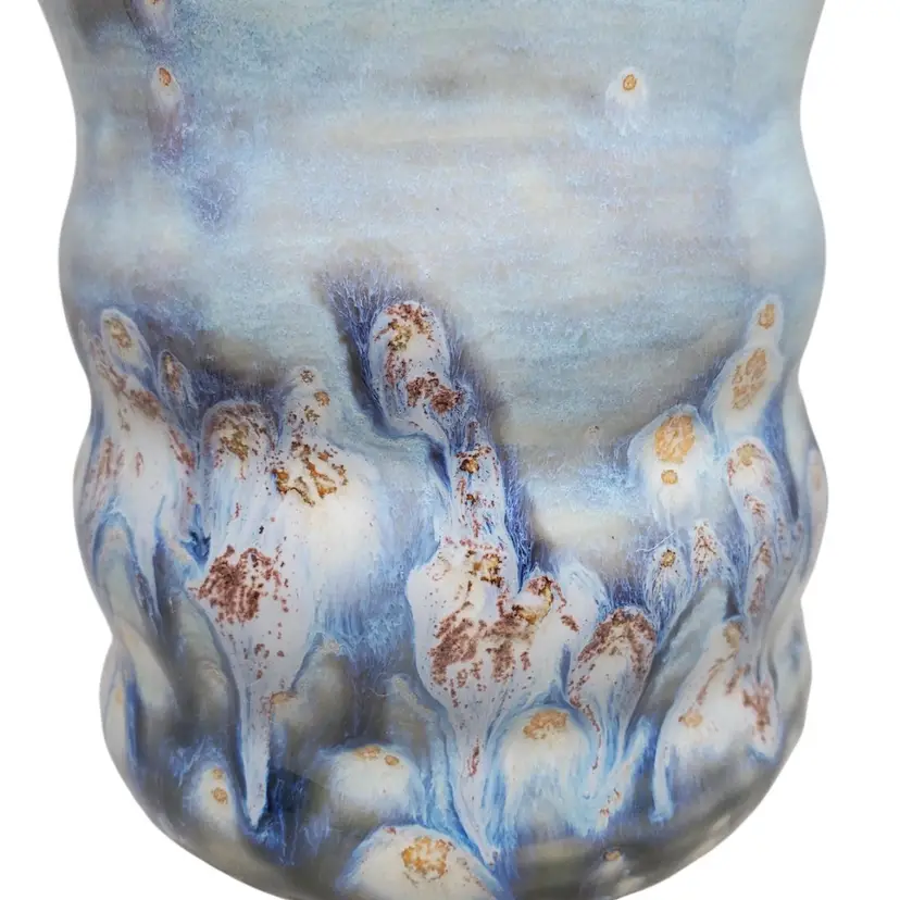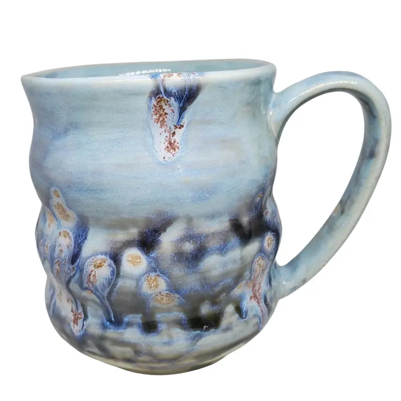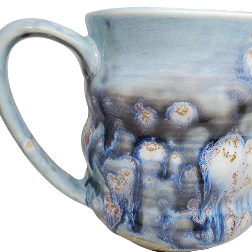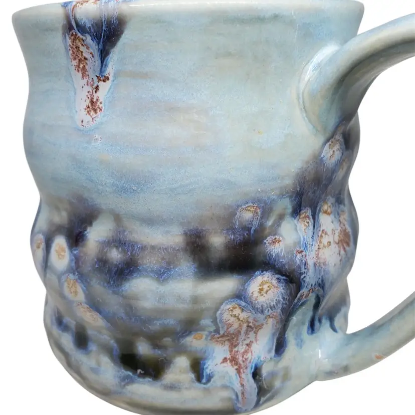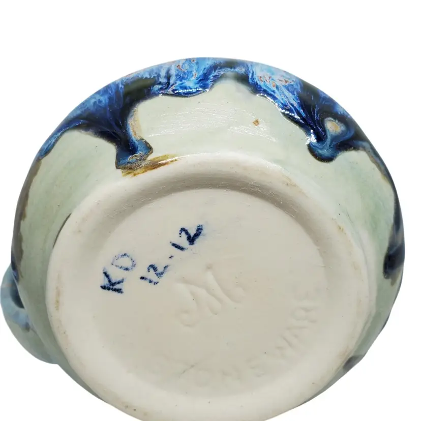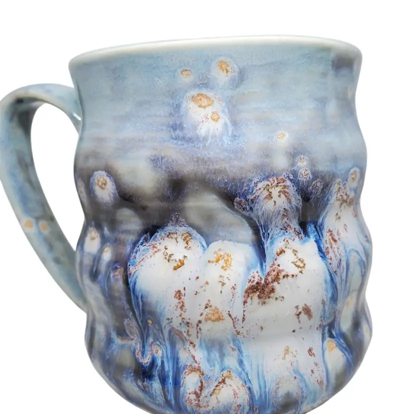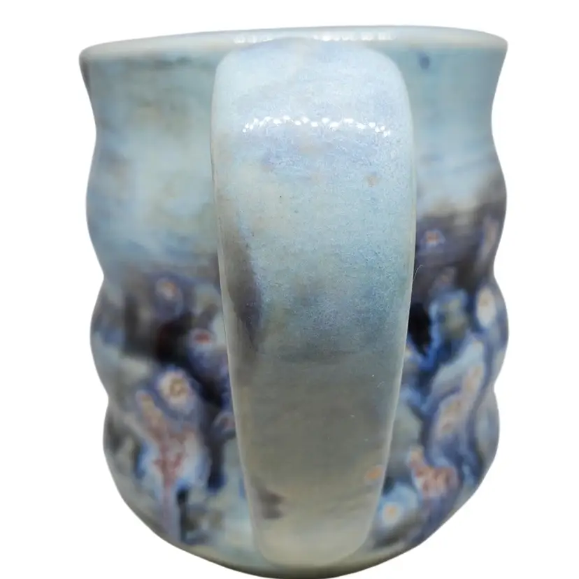 Beautiful Pre-owned light blue hues in larger size coffee mug. Excellent condition. Great glaze and colors.